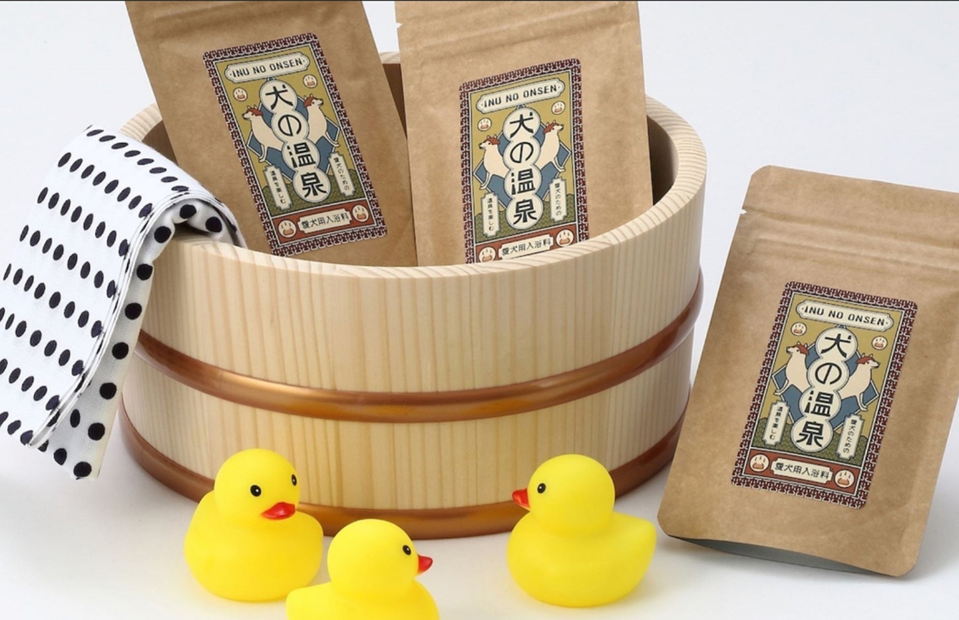 ・犬の温泉スタートセット(犬の温泉50g + 豆絞り手ぬぐい + アヒルのおもちゃ)※1組につき1つお渡し