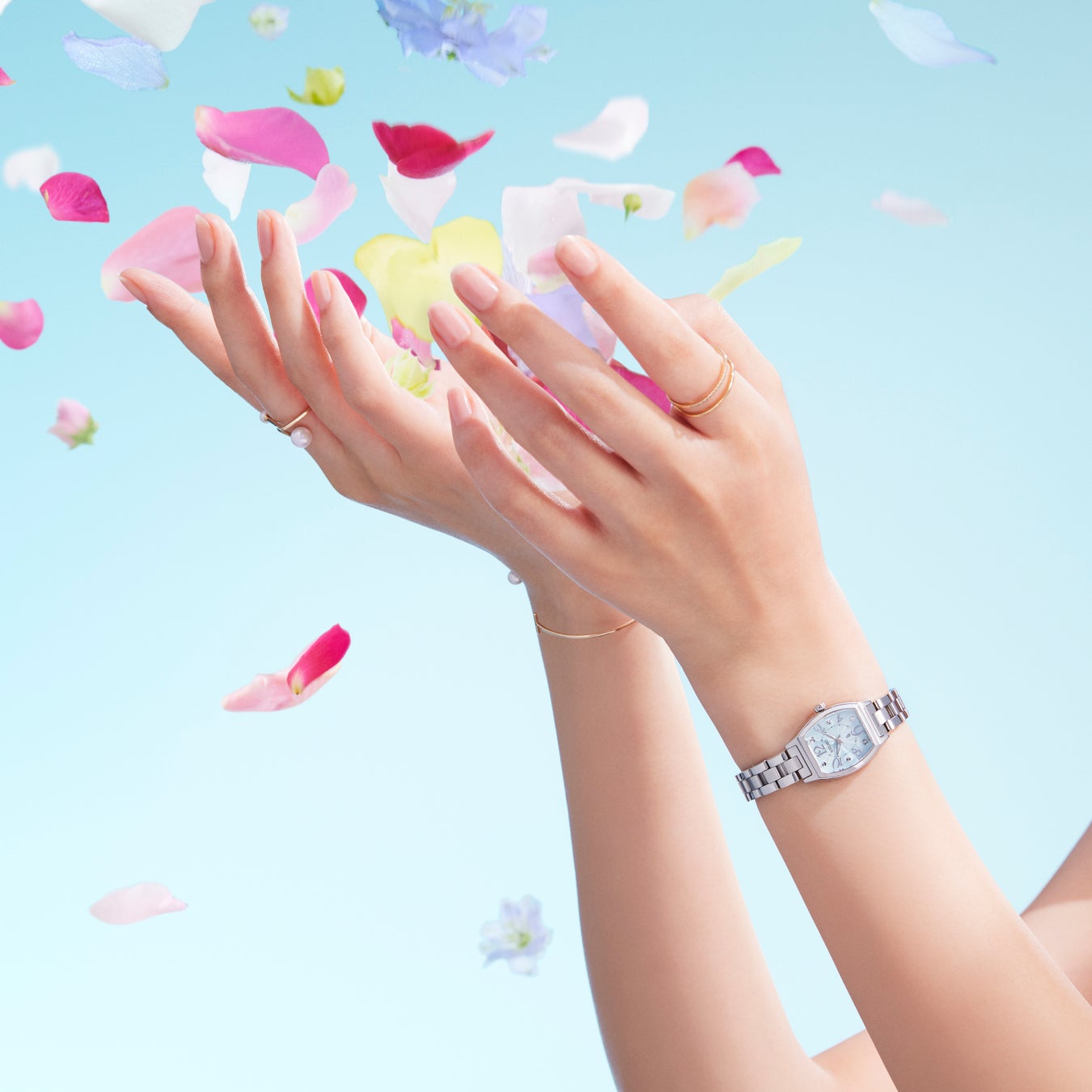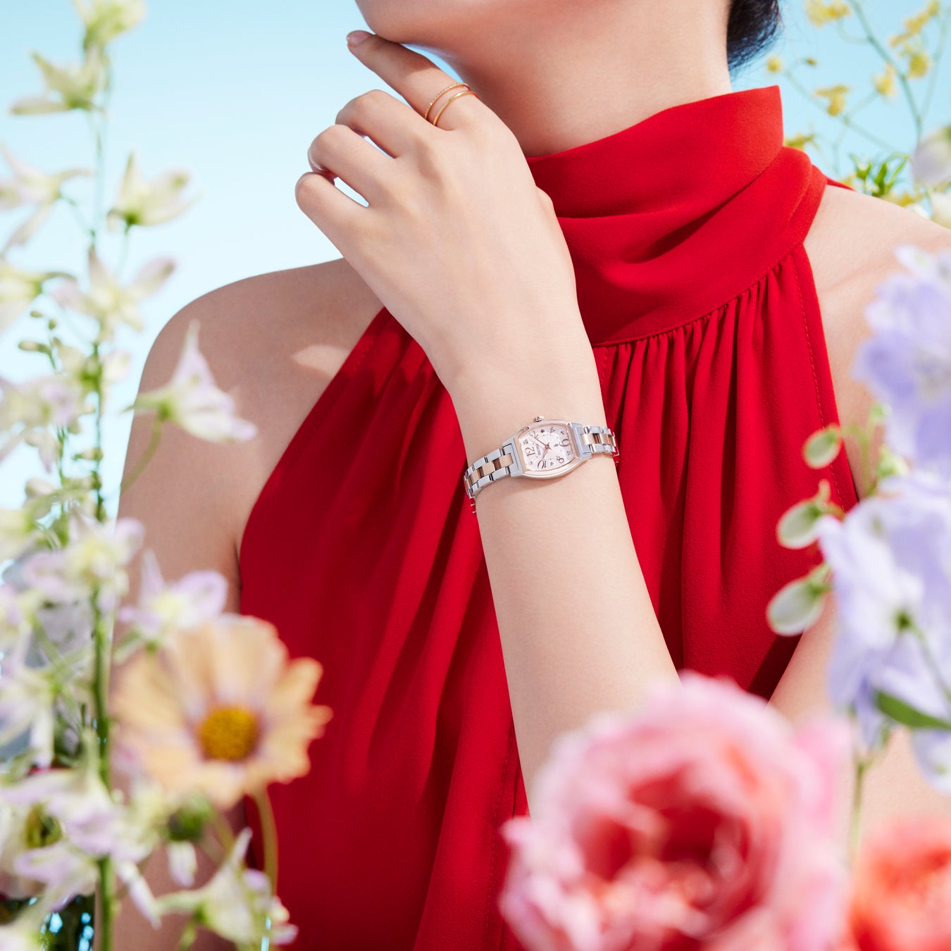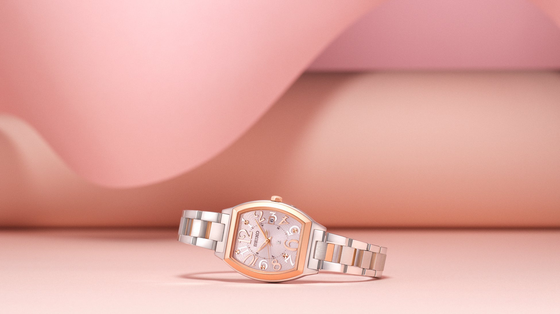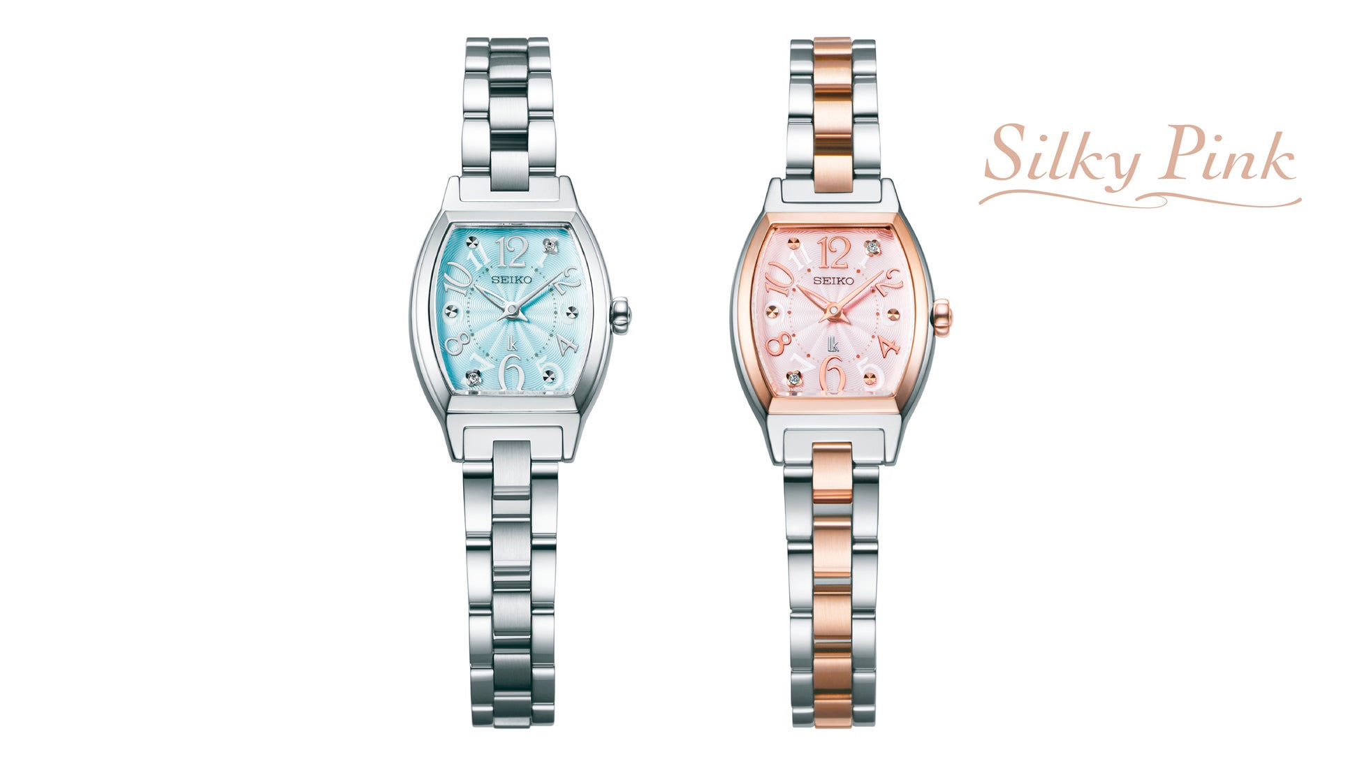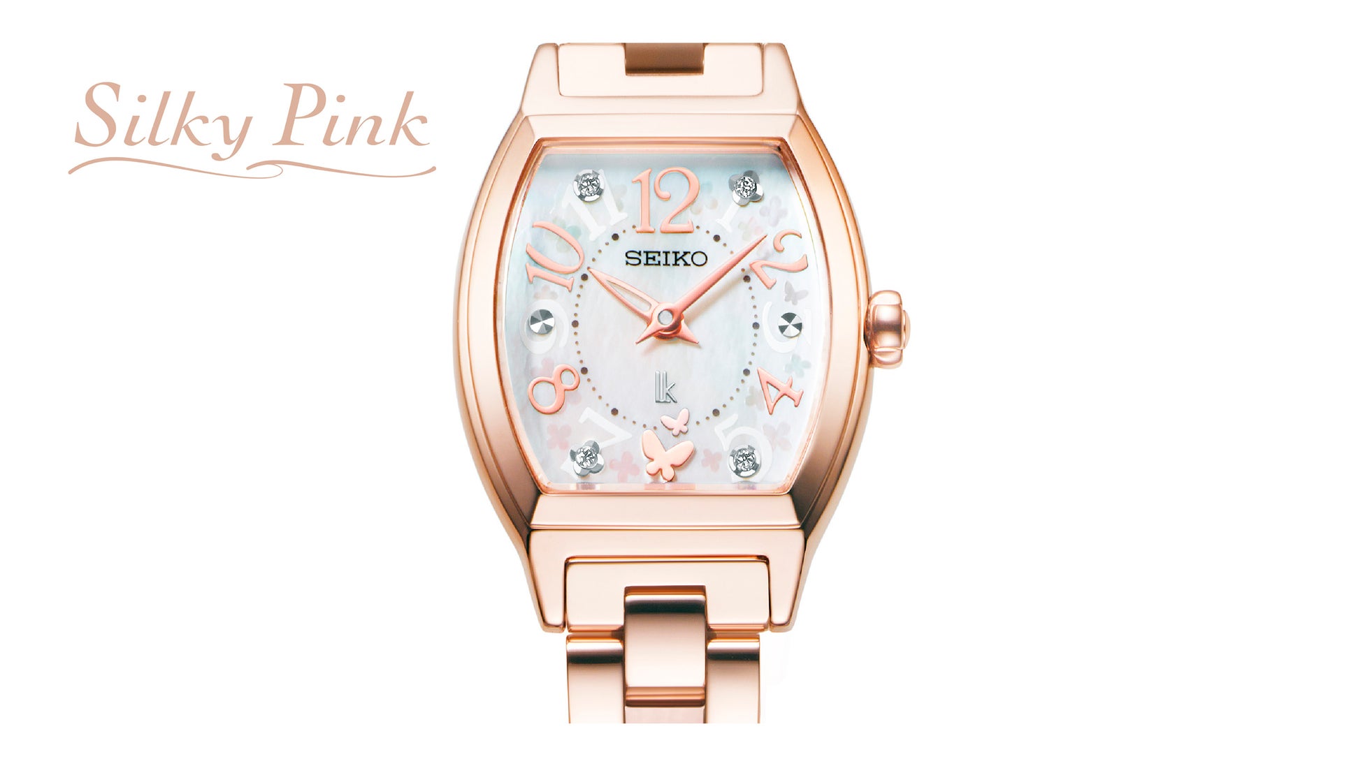 広告に掲載しているモデルの「SSWA012」は、ケースやブレスレットに柔らかなピンクゴールドカラーのシルキーピンクを纏い、愛らしさを引き立てています。