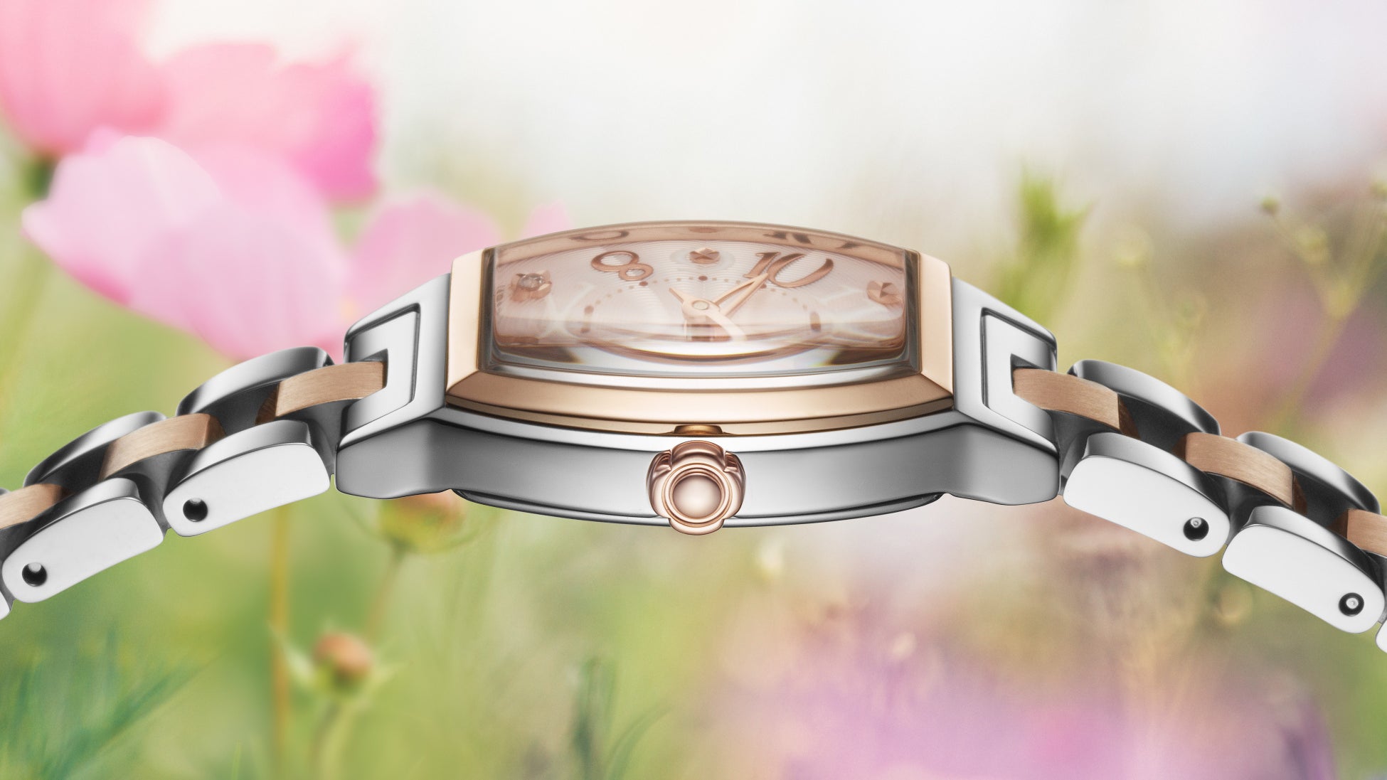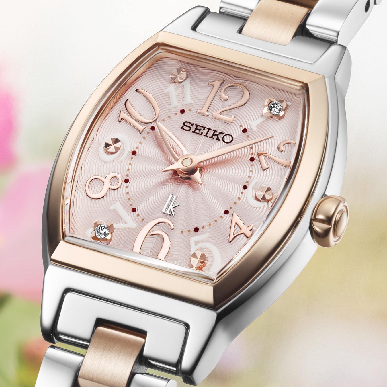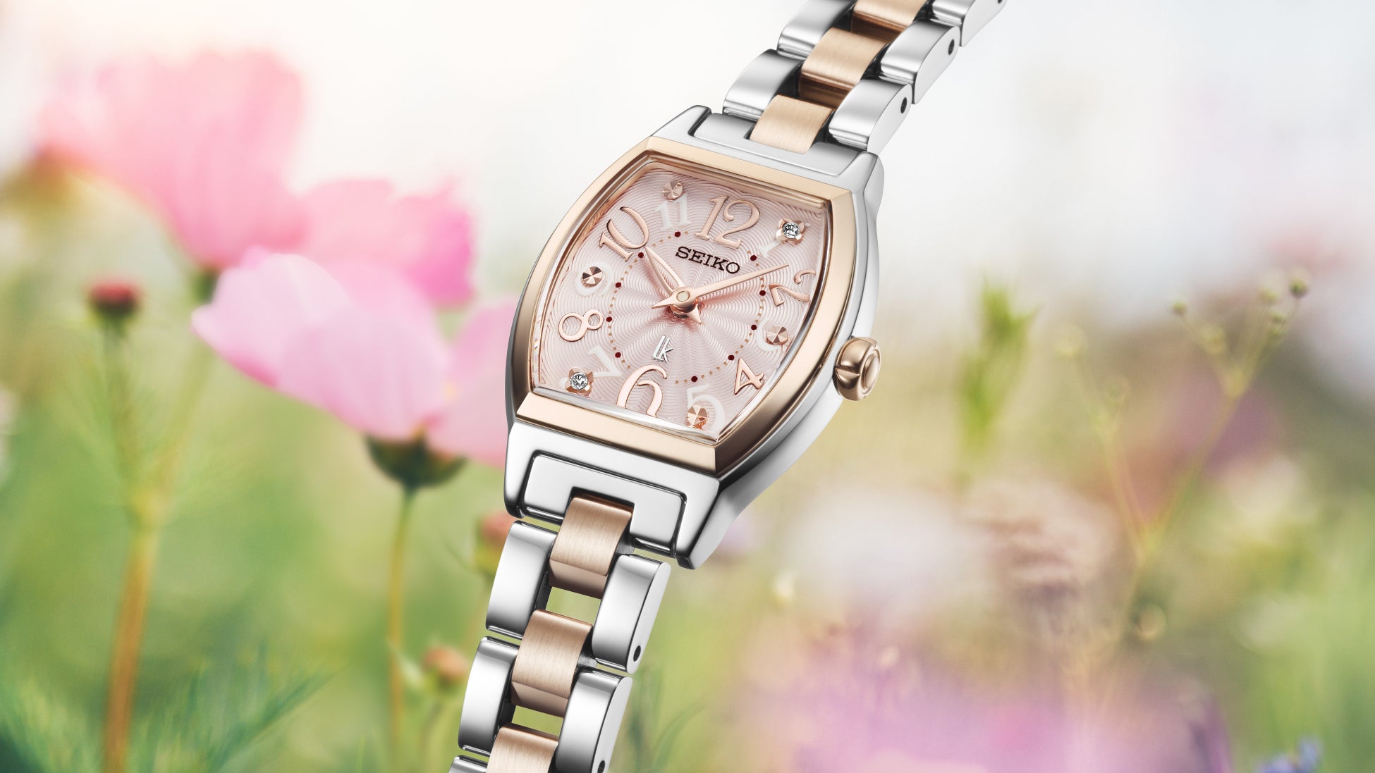 トノー形の「SSWA014」は、色とりどりに咲く花の愛らしさからインスピレーションを得ています。ケースやブレスレットの柔らかなシルキーピンクに合わせて、アラビア数字や時分針もピンクカラーで統一しました。1時・5時・7時・11時位置のインデックスには、ラボグロウン・ダイヤモンドが煌めき、優美でありながら愛らしいデザインとなっています。