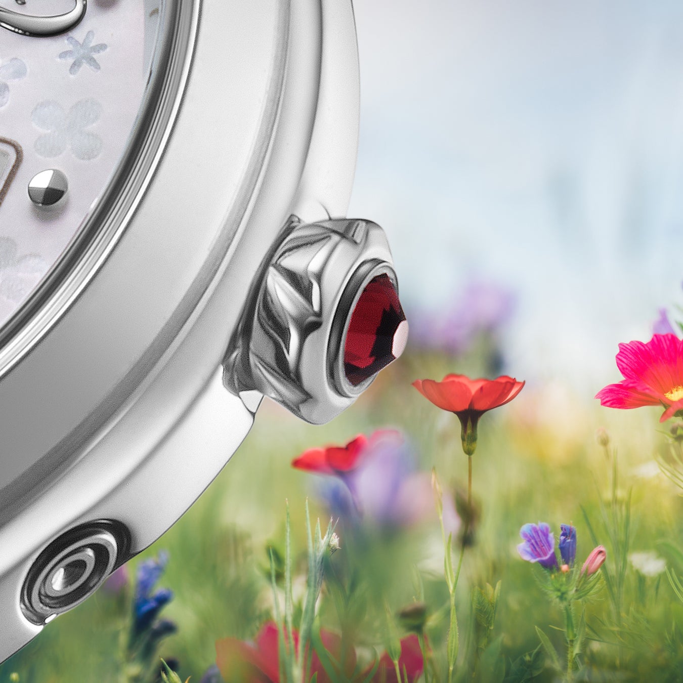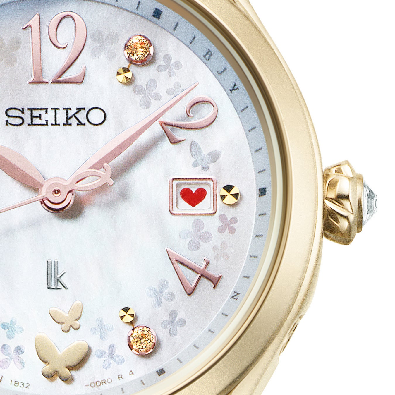 りゅうずの形状は、ダイヤル上のクローバー形のダイヤモンド台座と連動し、クローバーをモチーフとして新たにデザインしています。