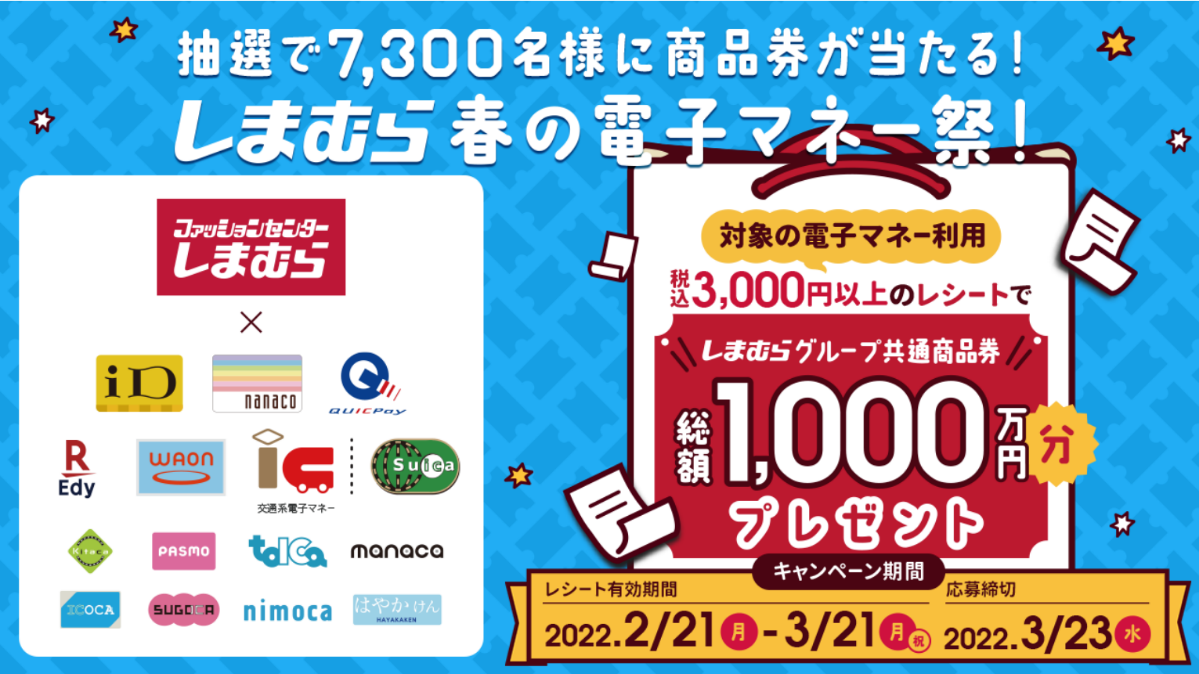 | 内容 | 3,000円(税込)以上の対象電子マネー利用でのレシートを用いて、キャンペーンページから応募すると、抽選でしまむらグループ共通商品券をプレゼント <キャンペーン詳細はこちら> https://ap.pitsquare.jp/osaifu/campaign/shimamura/202202/ |