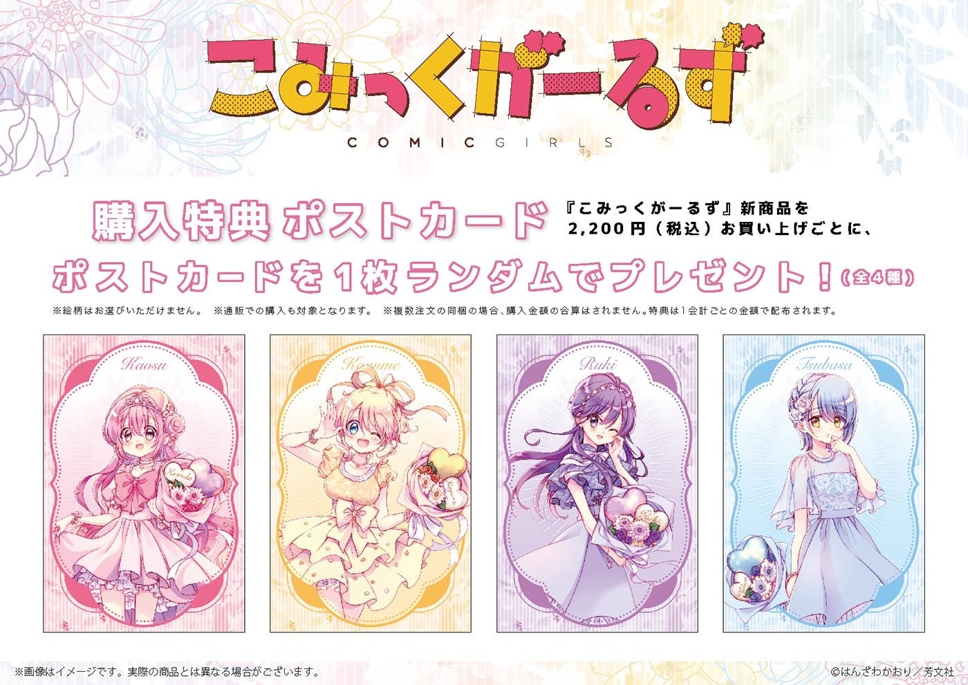 『こみっくがーるず』の新作グッズを2,200円(税込)お買い上げごとに、ポストカード(全4種)をランダムで1枚プレゼントします!