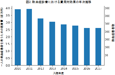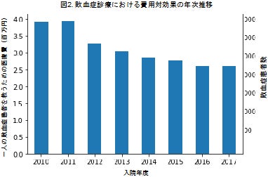 ・一人の敗血症患者を救命するために必要となった医療費の総額は年々低下傾向であり、費用対効果は改善していました(図2)。