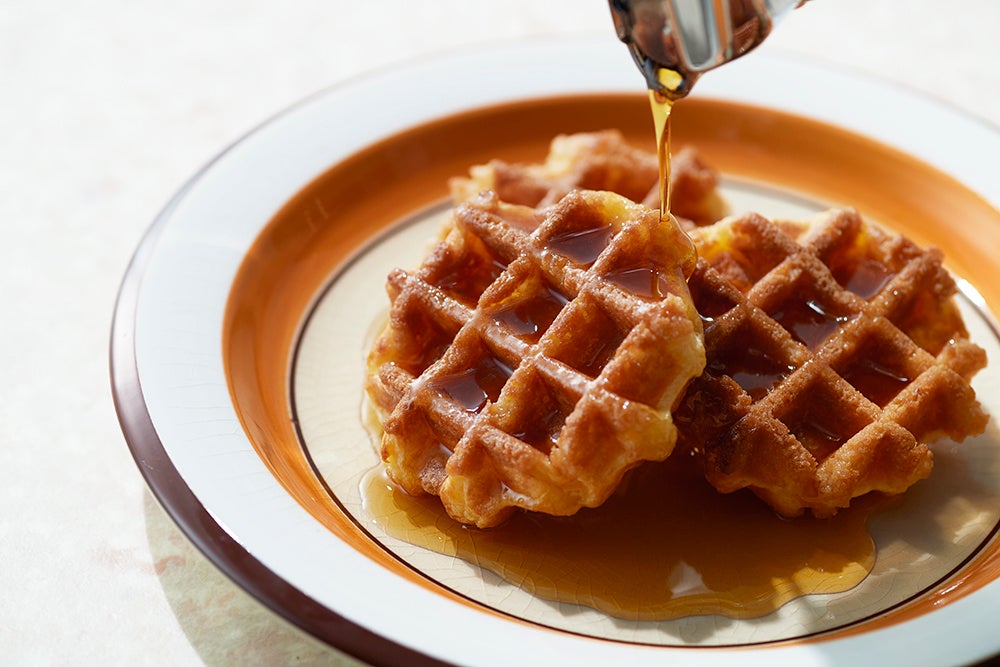 今までにないふんわり食感のワッフルに、アクセントとしてメープル味のクッキーをのせて焼き上げました。焼き上がりのサクッとした食感のクッキーとふんわり食感のワッフルを組み合わせた2層仕立ての「メープルワッフル」です。