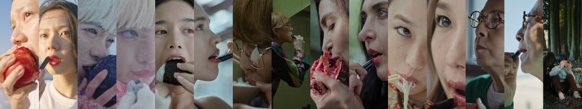 CMでは、それぞれのジャンルにおいて、これまでの枠にとらわれない活躍で、独自の存在感を放ち続ける方々をキャスティングしました。口紅を塗るという行為に、出演者それぞれが人生を力強く生きることを象徴するような「食べる」シーンを交錯させて描いています。それぞれの出演者のバックボーンを丁寧に紐解き、対話を重ねながら、力強く自分の人生を生きることに真摯に向き合うエネルギーが爆発するような、そんな生命感溢れる瞬間を切り撮りました。撮影に関しては、演技ではない自然なその人らしい表情が生まれるよう、一対一で向き合いながら撮影する、ドキュメンタリー的手法を用いています。
