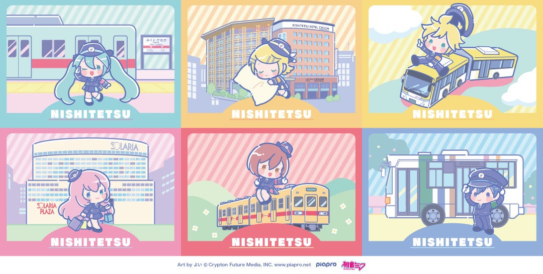 西鉄の制服を身にまとった、「初音ミク」「鏡音リン」「鏡音レン」「巡音ルカ」「MEIKO」「KAITO」