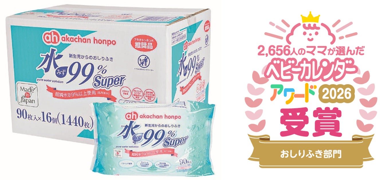 株式会社赤ちゃん本舗(本社:大阪市中央区 https://www.akachan.jp)は、2026年1月13日(火)「ベビーカレンダー」が発表する「ベビーカレンダーアワード2026」で、アカチャンホンポ オリジナル商品の「水99%Super 新生児からのおしりふき スタンダードタイプ」がおしりふき部門で「水分量」と「価格」が評価され2位を受賞いたしました。