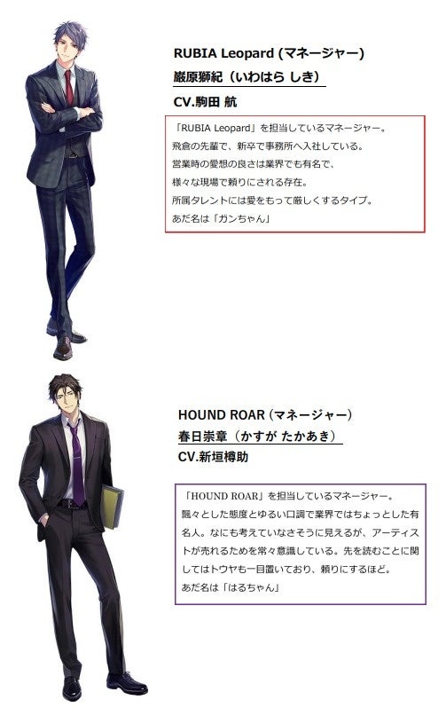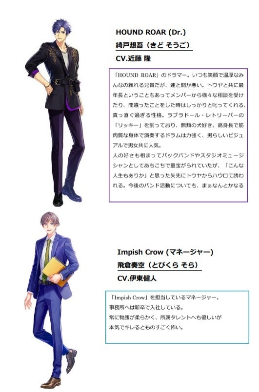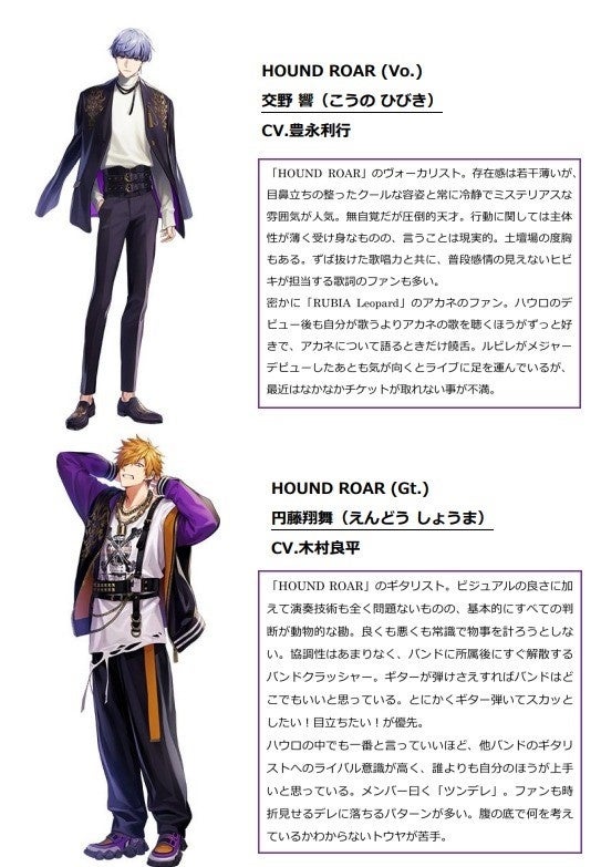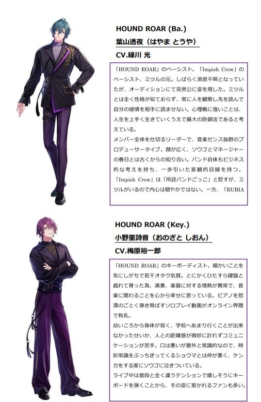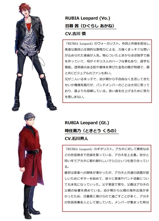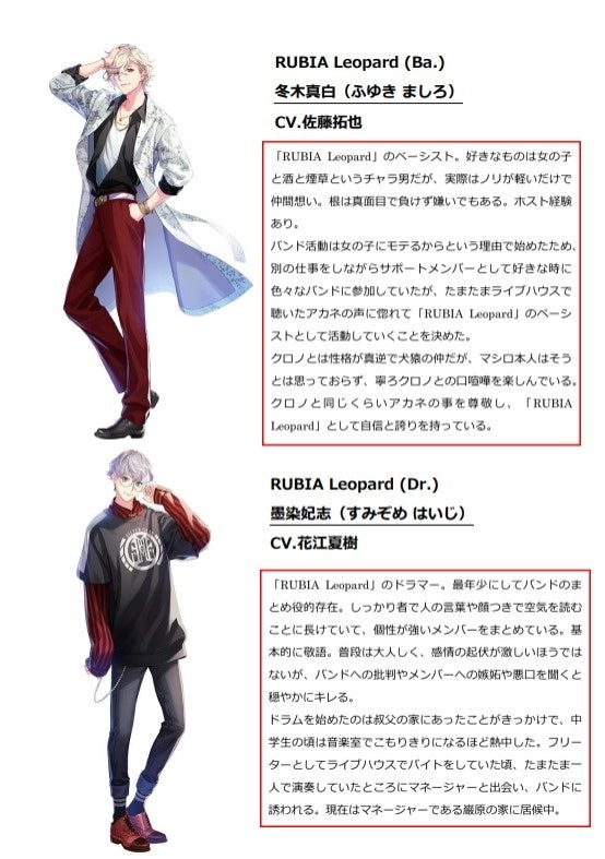 キャストは、天下無双“完璧王様”ヴォーカリスト「日暮 茜(ひぐらし あかね)」に古川 慎、碧血丹心“忠実堅物”ギタリスト「時任黒乃(ときとう くろの)」に石川界人、流麗飄々“女好きのモテ男”ベーシスト「冬木真白(ふゆき ましろ)」に佐藤拓也、察言観色“しっかり者の最年少”ドラマー「墨染妃志(すみぞめ はいじ)」に花江夏樹、ルビレを担当するマネージャー「巌原獅紀(いわはら しき)」に駒田 航を起用。