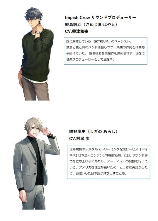 「Impish Crow(インピッシュ クロウ)」はインディーズとして活躍する中、マネージャー飛倉の声をきっかけに事務所所属となるルーキーバンド。夢を諦めないポジティブさをテーマに、ツグミの伸びのある声とトキによる歌詞、力強いロックが特徴。略称は「インクロ」。バンドモチーフは「カラス」。