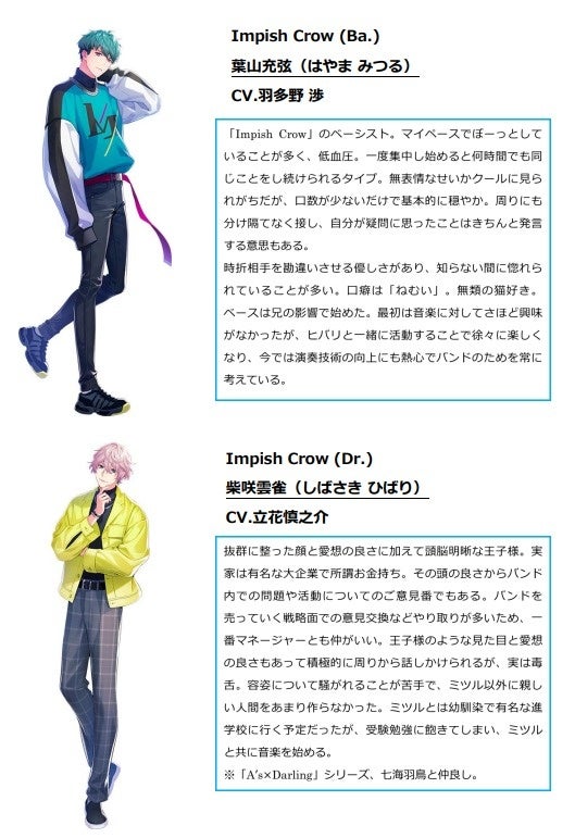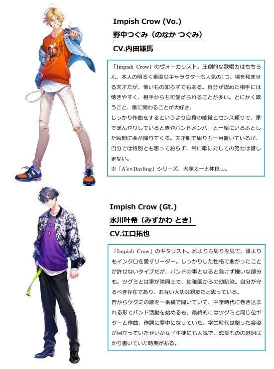 キャストは、天真爛漫“秘めたる才能”ヴォーカリスト「野中つぐみ(のなか つぐみ)」に内田雄馬、一諾千金“愛されリーダー”ギタリスト「水川叶希(みずかわ とき)」に江口拓也、泰然自若“天然たらし”ベーシスト「葉山充弦(はやま みつる)」に羽多野 渉、外柔内剛“毒舌王子”ドラマー「柴咲雲雀(しばさき ひばり)」に立花慎之介、インクロを担当するマネージャー「飛倉奏空(とびくら そら)」に伊東健人を起用。