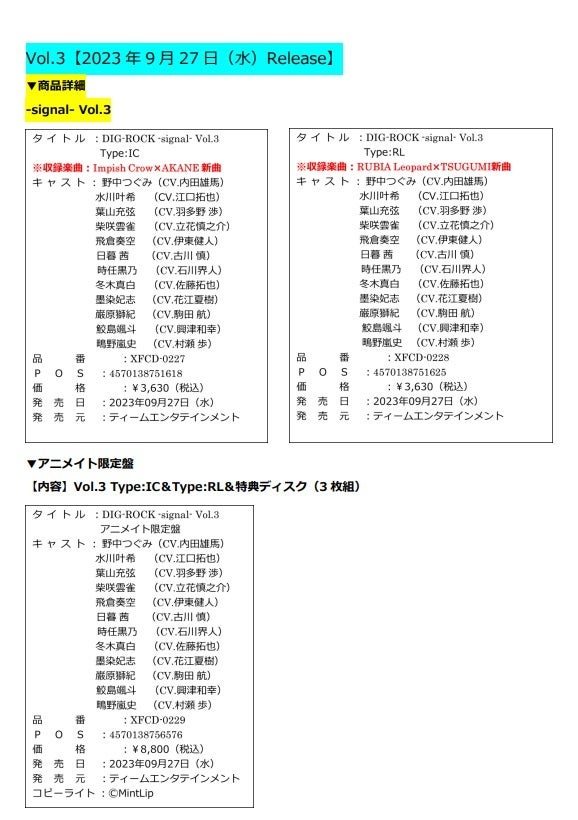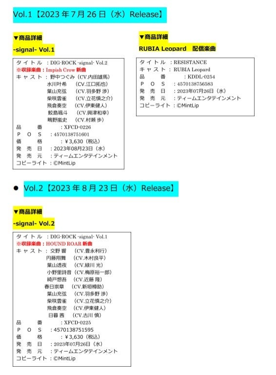 前作「alive」を経て、彼らのとある「きっかけ」と成長の「合図」を描く物語。各バンドの新曲はもちろん、「RUBIA Leopard(ルビア レパード)」の単独配信楽曲や、シリーズ初となるツグミ(CV.内田雄馬)とアカネ(CV.古川 慎)によるツインボーカル楽曲の収録も!