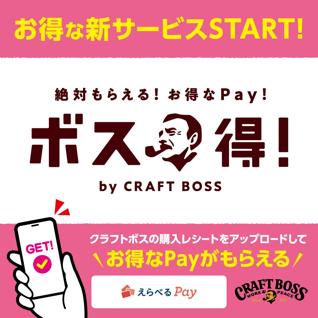 「ボス得!」とは、ボス得!公式LINEアカウントを友だち追加して、対象の商品に貼られた告知シールや、店頭POPからキャッシュバッククーポンを獲得いただき、対象のクラフトボスの購入レシートをアップロードいただくと、えらべるPayに交換できるキャンペーンとなります。