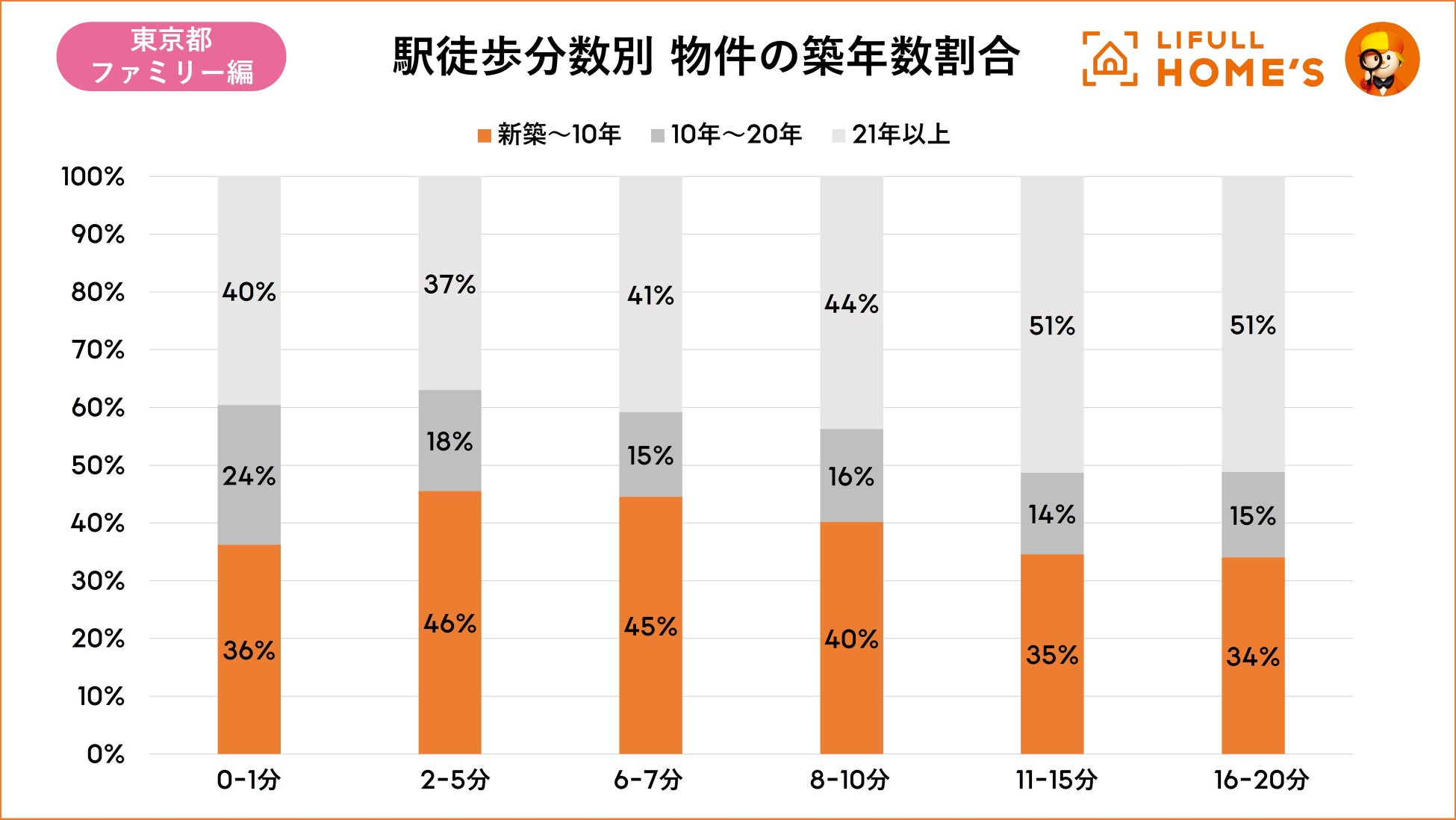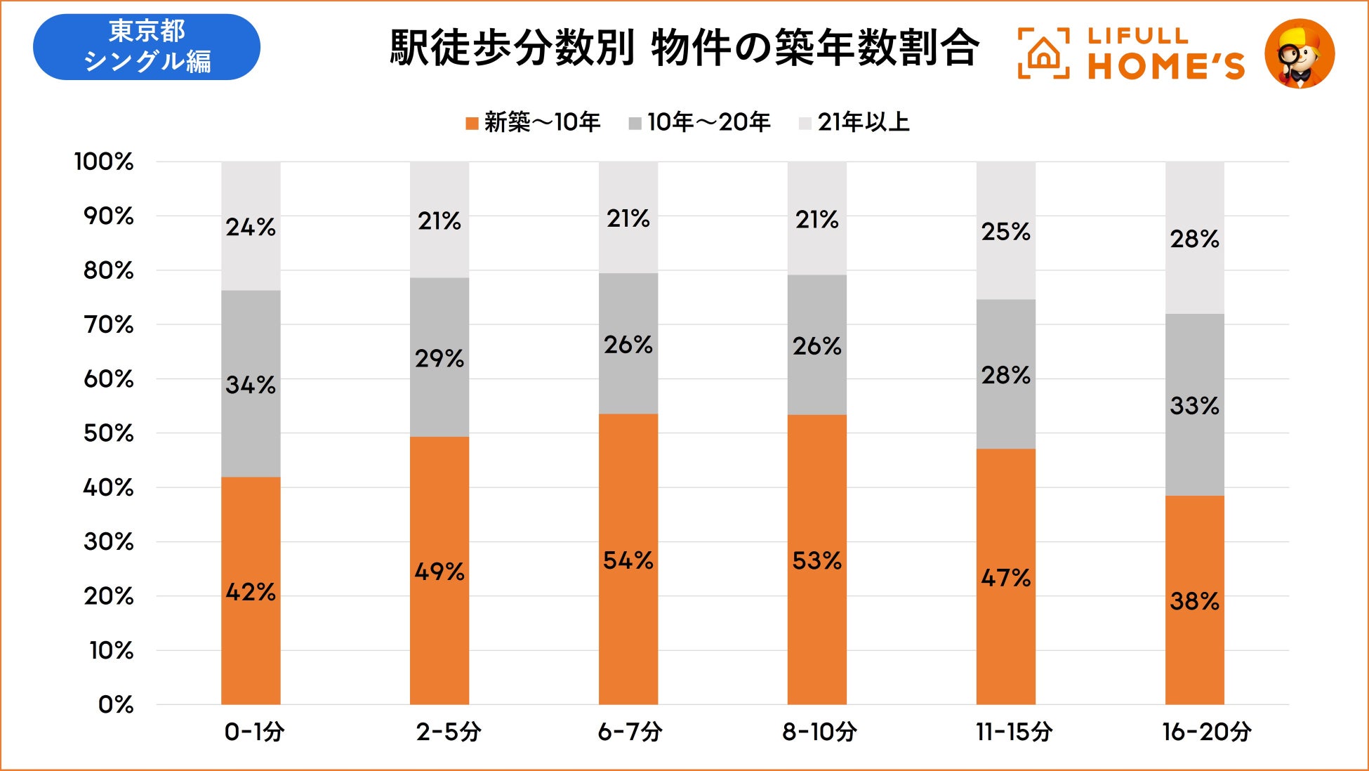 また、駅徒歩分数と物件の築年数の割合をみてみると、掲載期間が比較的短かった駅徒歩2~15分のエリアは、築10年以内の物件の割合が高い傾向となりました。