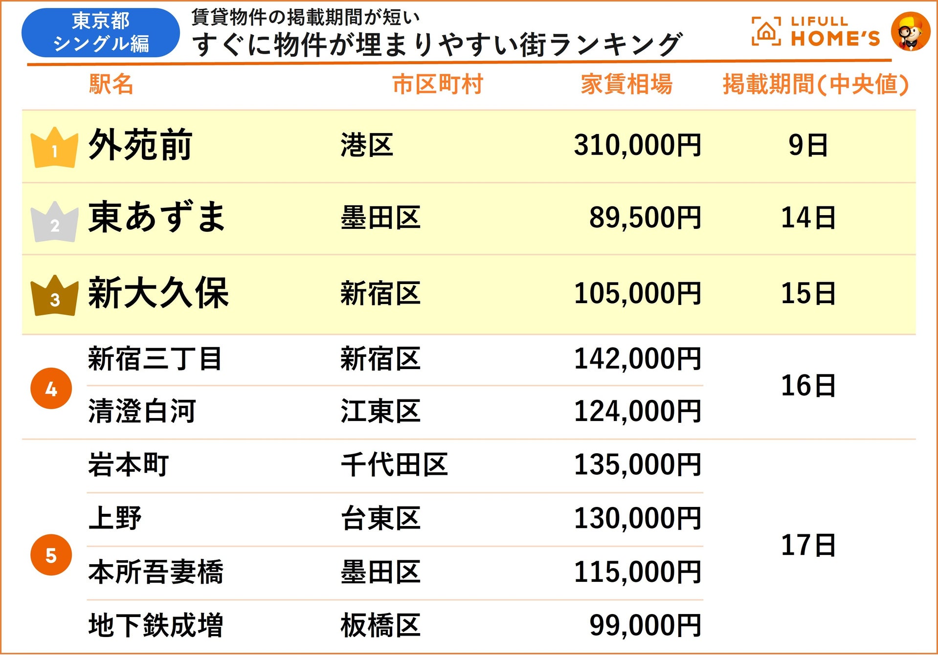 シングル編の1位は東京メトロ銀座線の「外苑前」(家賃相場:310,000円)で、掲載期間(中央値)は9日間となりました。「外苑前」は渋谷や新橋など主要駅へのアクセスもよく、都心に近くありながらも静かなエリアで人気を集めています。2位は東武亀戸線の「東あずま」(家賃相場:89,500円)となりました。家賃相場が8万円台と、ランキング上位の中では抑えめですが、複数路線が乗り入れる錦糸町へも約11分で行くことができるほか、東京や上野へも30分以内で行くことができます。