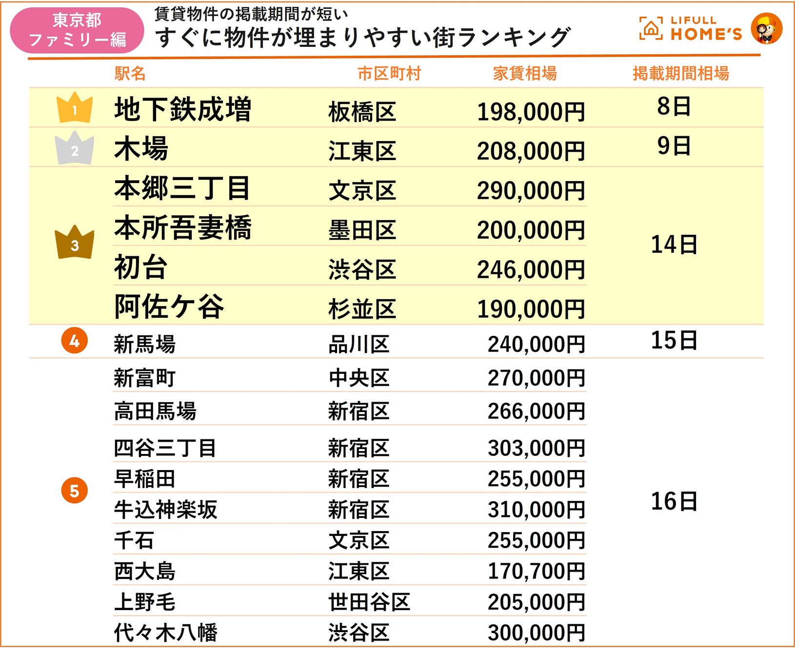 ファミリー編1位は板橋区の「地下鉄成増」で掲載期間中央値は8日間