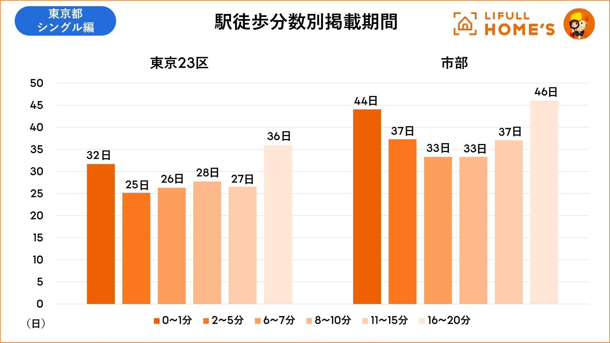 すぐに物件が埋まりやすい街ランキング上位には東京23区内の駅が並びましたが、23区と市部とを比較すると、市部のほうが全体的にやや掲載日数が長いものの、駅徒歩分数別で見るといずれも2-15分の物件で比較的掲載日数が短い傾向にあり、23区と市部で類似する結果となりました。