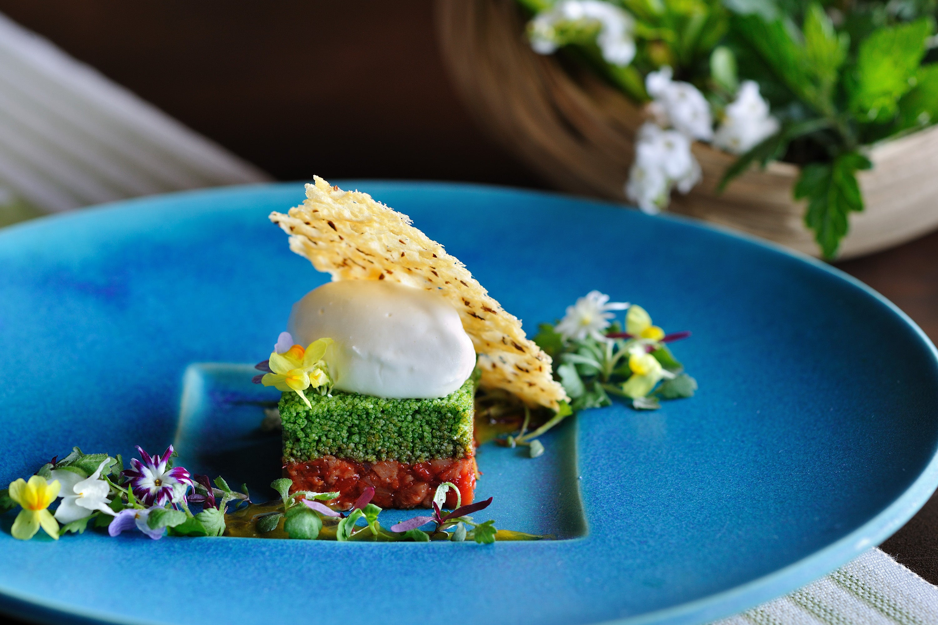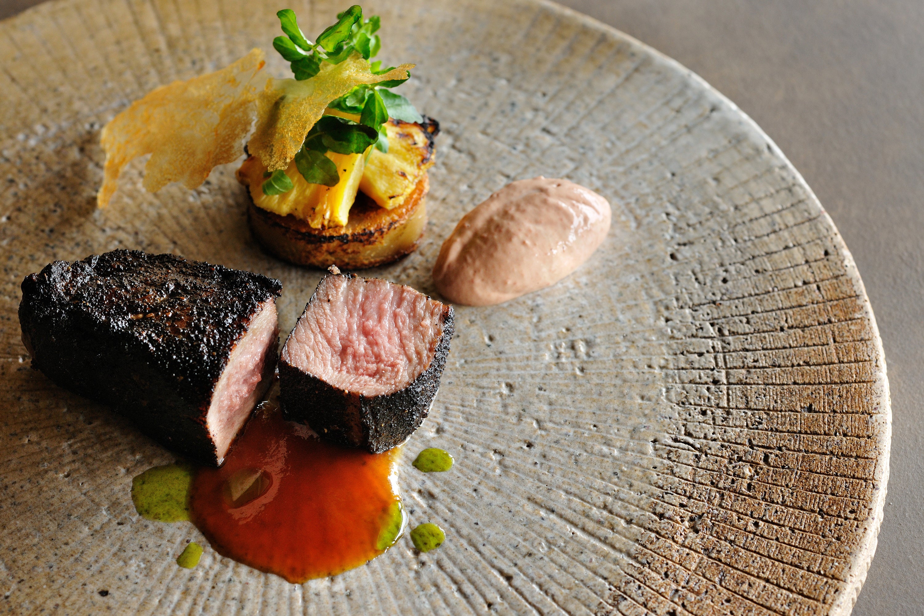 良質な肉に育った仔山羊を、フレンチ技法で昇華させた一品。低温調理した仔山羊のタルタルの上に、フーチバ(ヨモギ)を混ぜ込んだクスクスを合わせました。臭みが少なく食べやすい仔山羊と、クスクス、濃厚なシェーブルチーズのクリームとパッションフルーツのソースをすべて混ぜ合わせて楽しみます。仔山羊の旨味と、スパイスや果実のアクセントが驚きの味わいを織りなします。