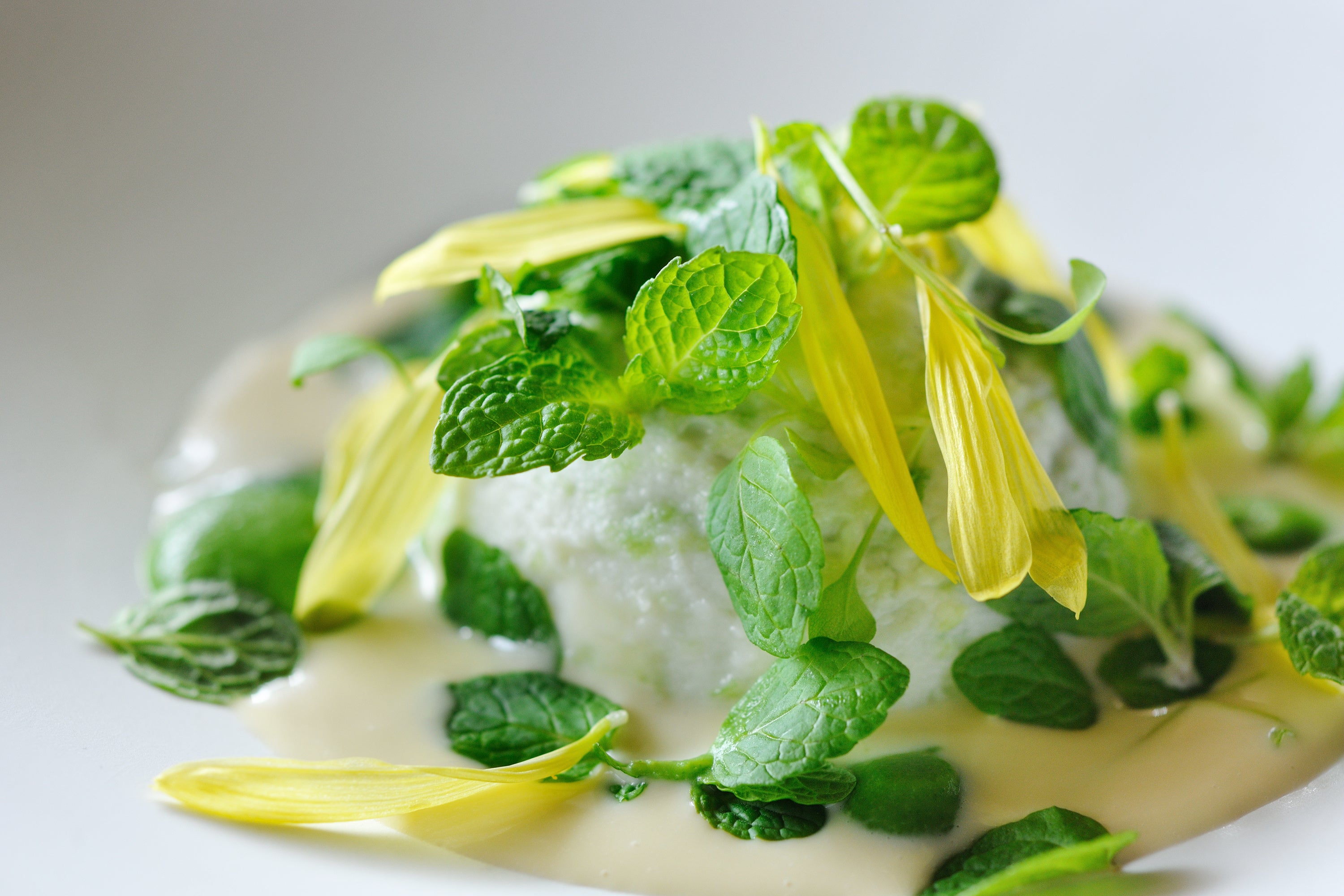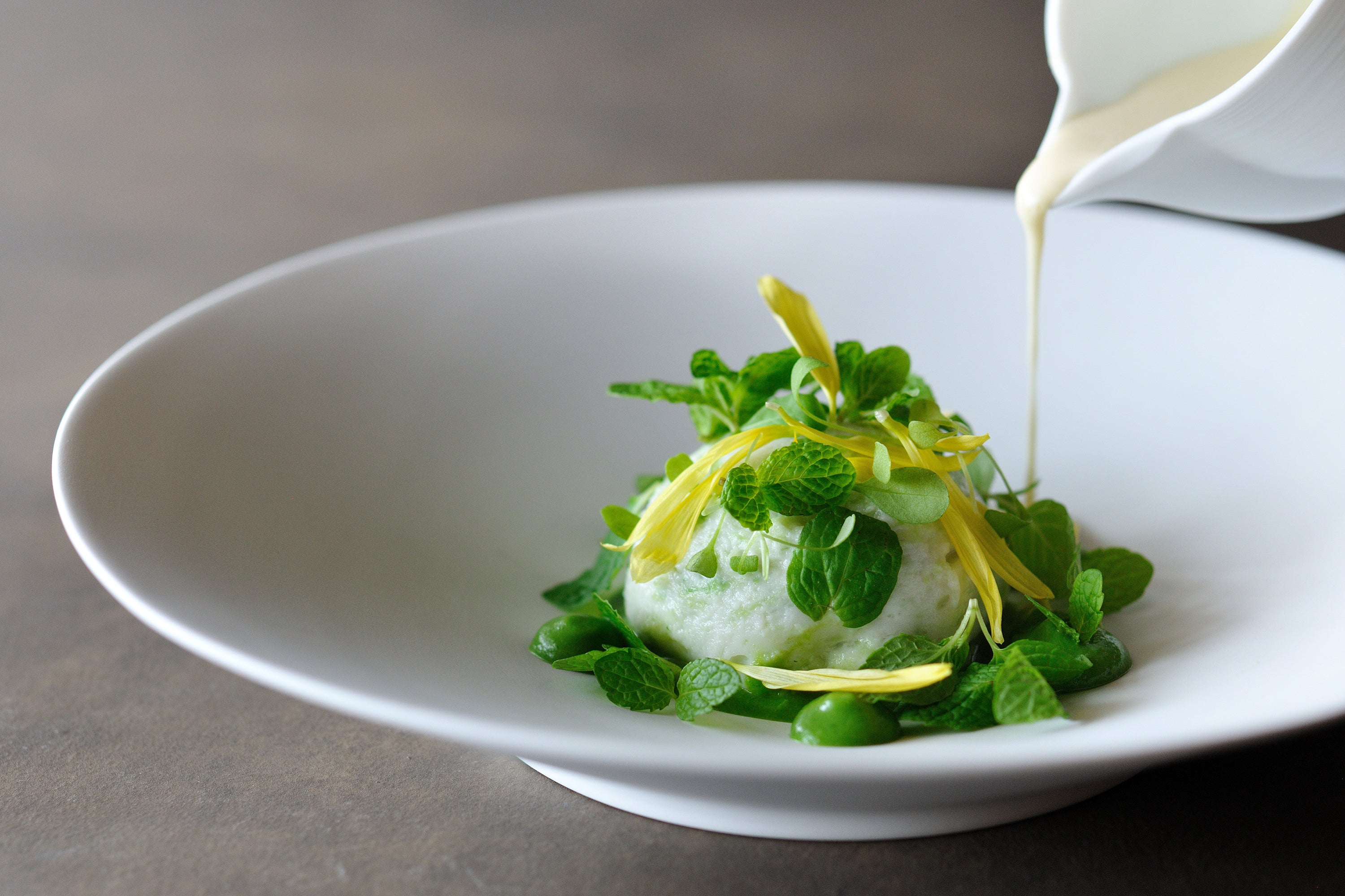 沖縄の高級魚である白身魚「ミーバイ」を帆立とアーサー(あおさ)のムースで包み、蒸しあげた一品。魚に間接的に火を通すことで、しっとりと柔らかい食感に仕上げました。泡立てたヴァンブランソース(白ワインとクリームのソース)を絡めて食べると、軽やかな口当たりを楽しむことができます。そして、料理に春らしい彩りを加えるためにミントと青豆のピューレを添えました。さらに、料理全体がミントやレモンバームなどのハーブを纏うことにより、一口食べるごとに春らしい香りが感じられます。フレンチの定番手法で仕立てた魚料理を、春の爽やかさを加えて深化させた一品です。