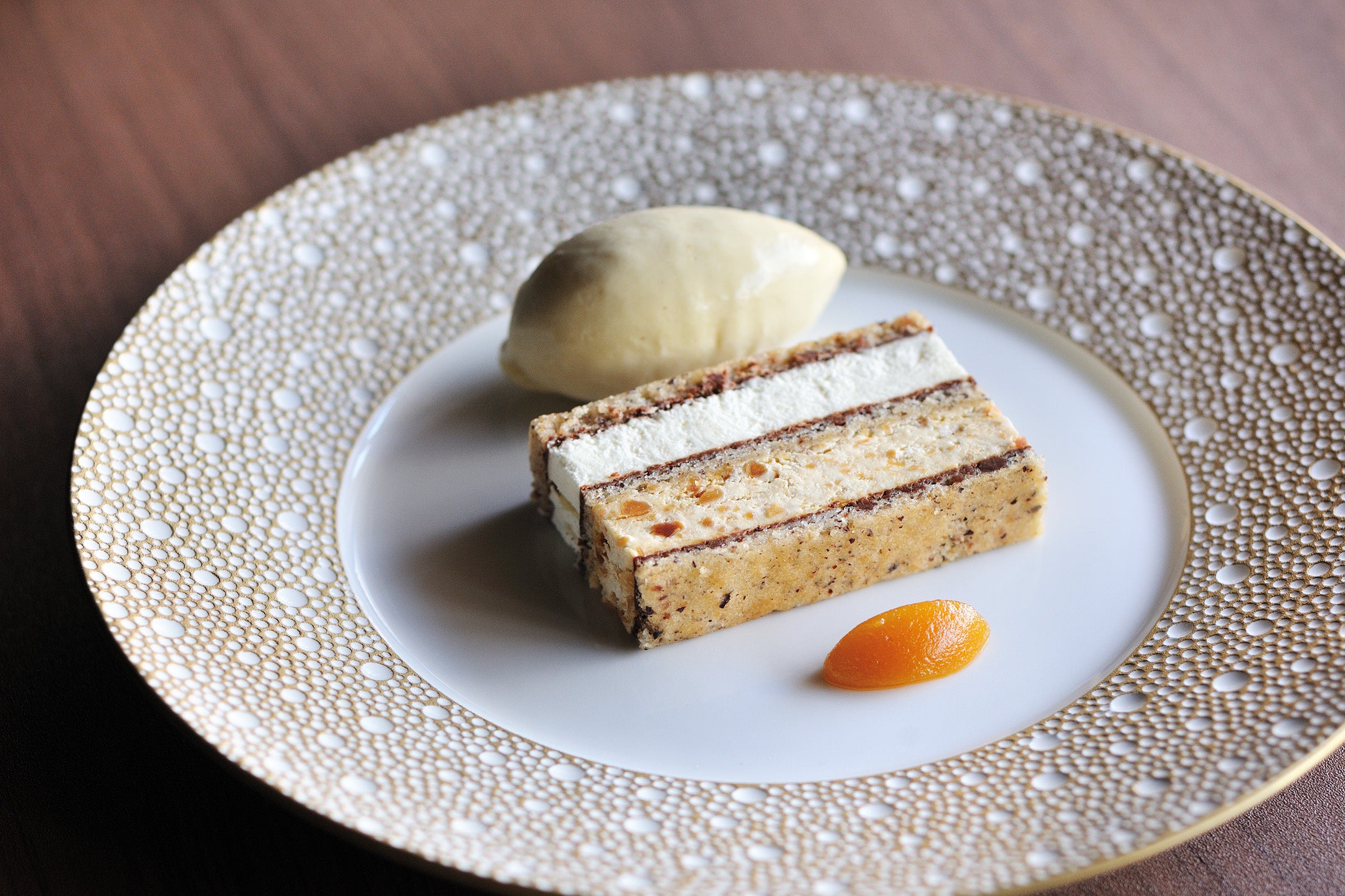 フランス発祥のクラシカルなデザートであるマルジョレーヌを、沖縄で高級食材とされていたピーナッツでアレンジしました。きめ細かく泡立てたクリームが口の中で滑らかに溶ける上品なデザートです。そこに甘みと酸味のバランスが特徴的な島バナナの味わいを表現したアイスクリームと、パイナップルを煮詰めたコンフィチュールを合わせています。王道でありながら、沖縄ならではの食材を取り入れることにより、別格な味わいを追求しました。