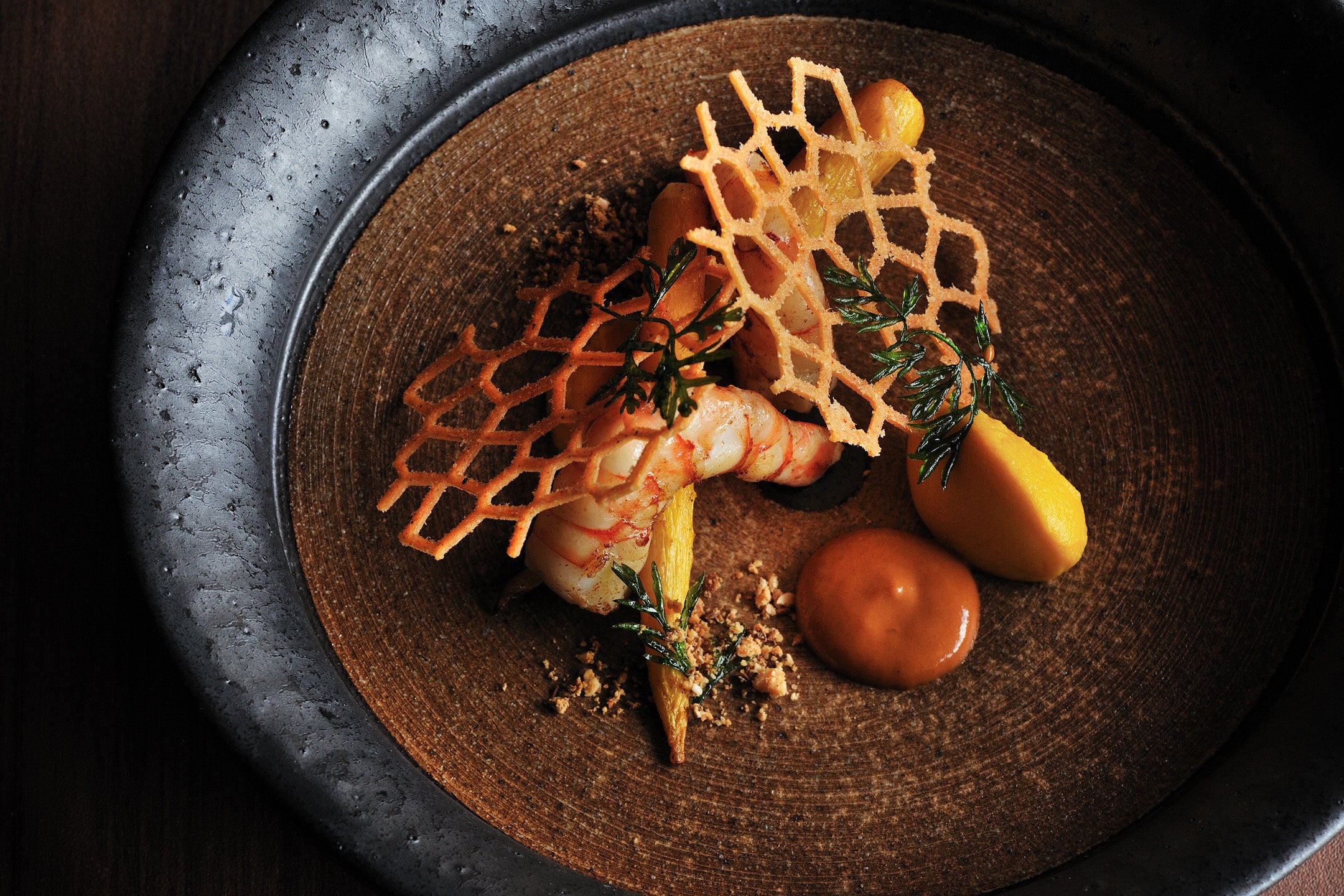 身が締まり甘みの強い車エビを、海老の旨味が凝縮されたアメリケーヌソースと合わせてポワレに仕立てました。付け合わせには島人参を使用しています。島人参は、一般的な人参よりも臭みが少ないと言われ、車エビと相性の良い食材です。アクセントにはデュカと呼ばれるミックススパイスを加えました。スパイスの香りと共に、素材本来の旨味や甘さを感じることができます。