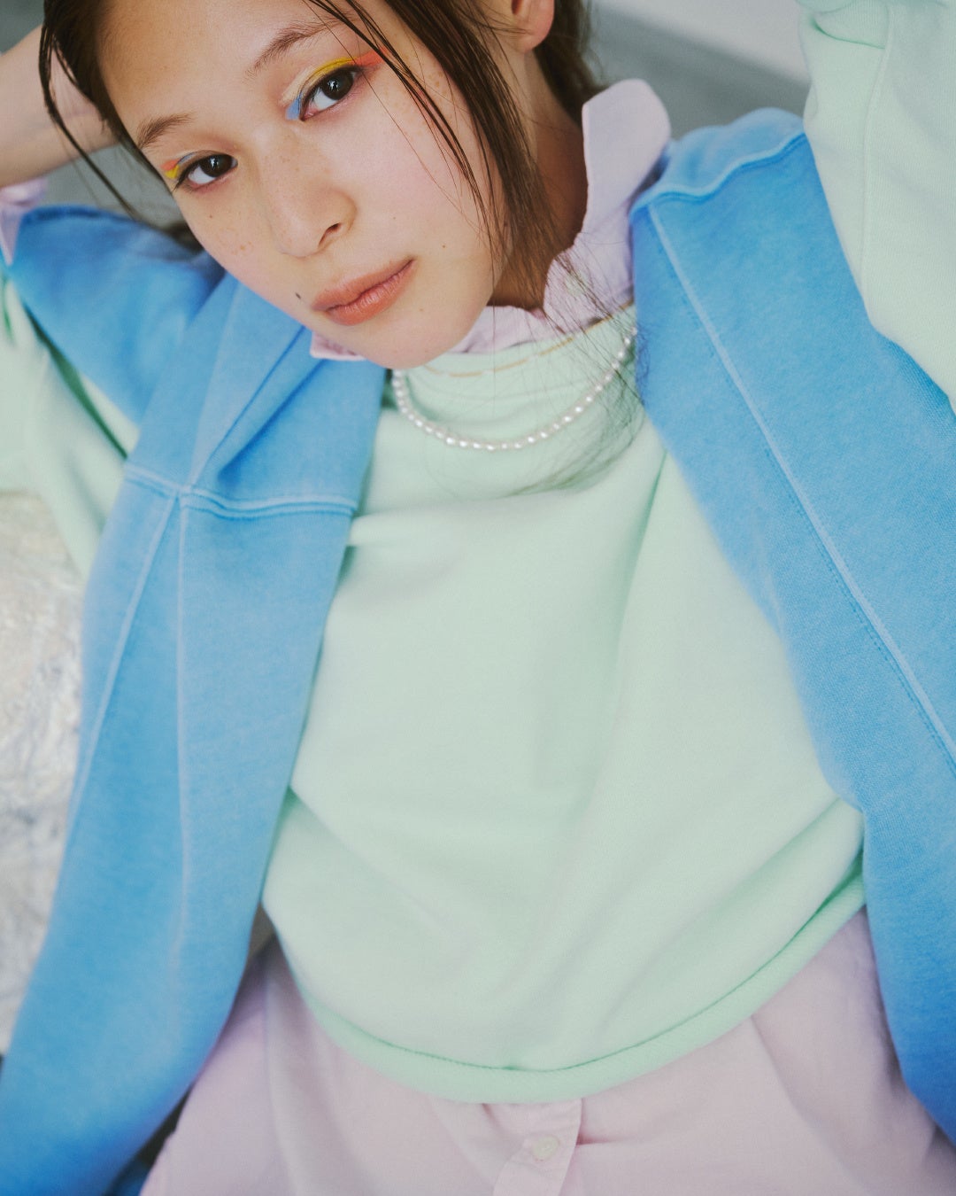 ピグメント加工でヴィンテージライクな色合いに仕上げたスウェット。