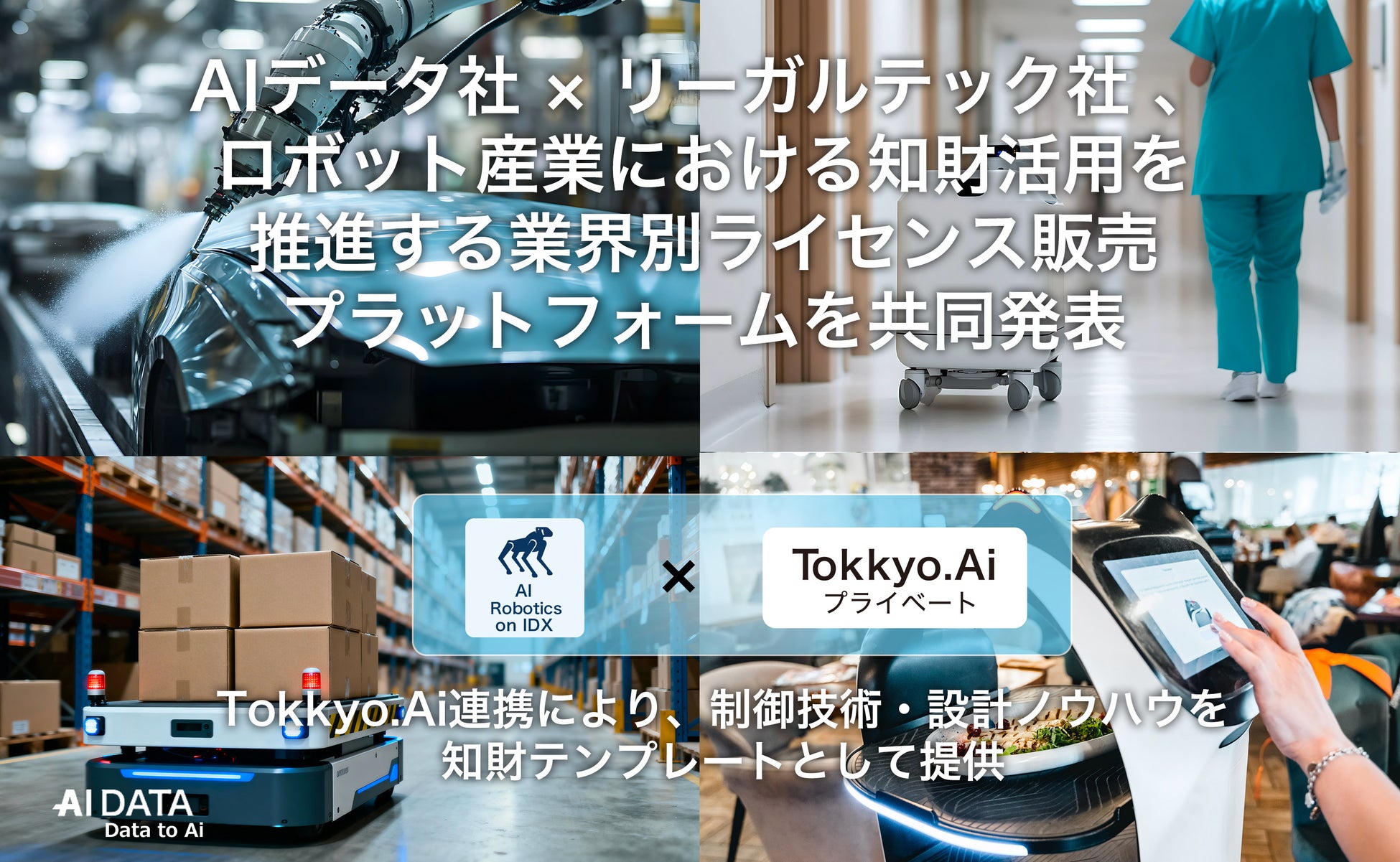 企業データとAIの利活用カンパニー、AIデータ株式会社(本社:東京都港区、代表取締役社長 佐々木隆仁、以下AIデータ社)と、リーガルテック株式会社(本社:東京都港区、代表取締役:平井 智之、以下リーガルテック社)は、ロボット産業における知財を基点とした新たな収益モデルとして、業界別ライセンス販売プラットフォームを共同で始動する。本取り組みは、生成AIによる知見抽出、知財テンプレート化、SaaSライセンス提供を組み合わせ、技術ノウハウを継続的に活用できる仕組みを構築するものである。