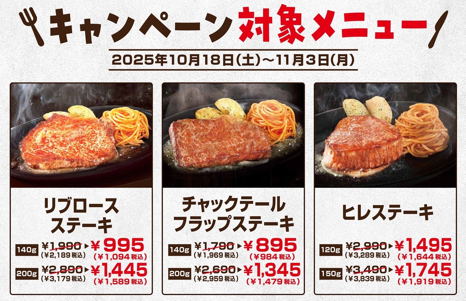 対象となるステーキは赤身と脂身のバランスが良い「リブロースステーキ」、希少部位を使用した肉肉しい味わいの「チャックテールフラップステーキ」、口の中でとろける食感を味わえる「ヒレステーキ」。