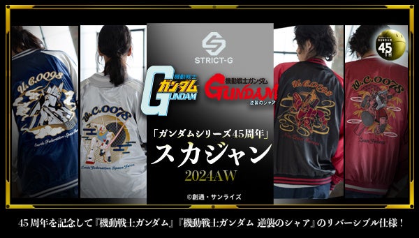 株式会社バンダイ ライフスタイル事業部では、ガンダムの世界観を取り入れたアパレルショップ「STRICT-G」より「ガンダムシリーズ」45周年を記念し、『機動戦士ガンダム』『機動戦士ガンダム 逆襲のシャア』よりリバーシブル仕様で、大胆な刺繍デザインを施したスカジャン2種をSTRICT-G各店舗にて、2024年9月28日(土)より販売いたします。また、店頭販売に先駆けて、バンダイナムコグループ公式通販サイト「プレミアムバンダイ」( https://p-bandai.jp/ )では、2024年9月20日(金)13時より予約販売を開始いたします。