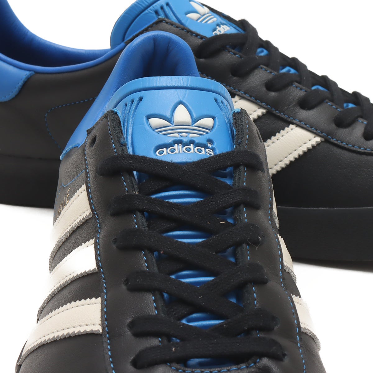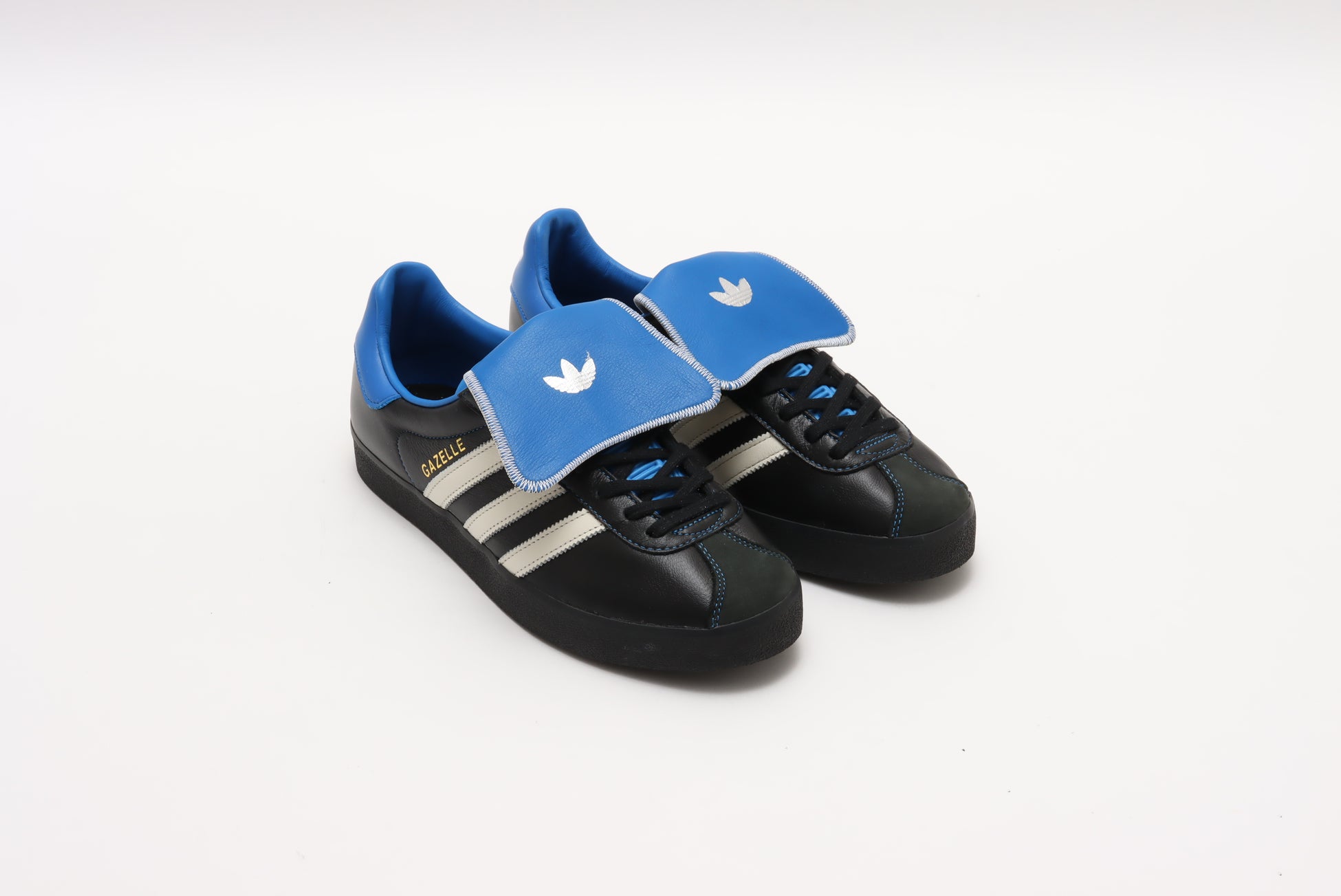 今作は、80年代にイギリスのリバプールを中心に巻き起こった、スポーツウェアをファッションとして取り入れる「テラススタイル」にも通じる一足。アトモスではそのUKスタイルを推すとともに、普遍的な1985年版のモデル、GAZELLE 85をアトモスのアイコニックなブルーをシュータンやライニングを採用し、刷新。アッパー全体は品格を醸し出すブラックレザーで覆い、ステッチ部分もブルーでまとめ上げた細部まで拘ったスニーカーです。