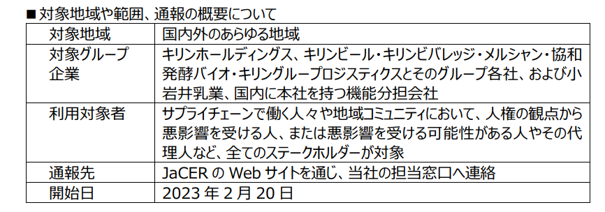 キリンホールディングス株式会社(社長 磯崎功典)は、一般社団法人ビジネスと人権対話救済機構(JaCER)が提供する「対話救済プラットフォーム」を活用し、人権尊重のための通報窓口(グリーバンスメカニズム)を2023年2月20日(月)に開設します。サプライチェーンを含む全てのステークホルダーからの通報を受け付ける仕組みを整えることで、人権尊重の取り組みを強化します。