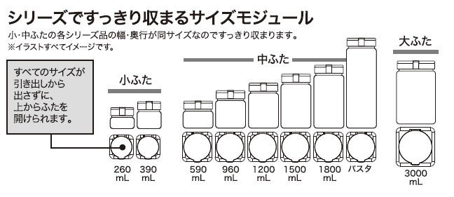 内容量も見直し、より容量が大きくなりました。また、お客様の声から、スパイスやナッツ類の保存に便利な260mlサイズとパスタが入る、パスタサイズも新しく追加し、入れるものや置き場所に応じて使い分けができるようになりました。