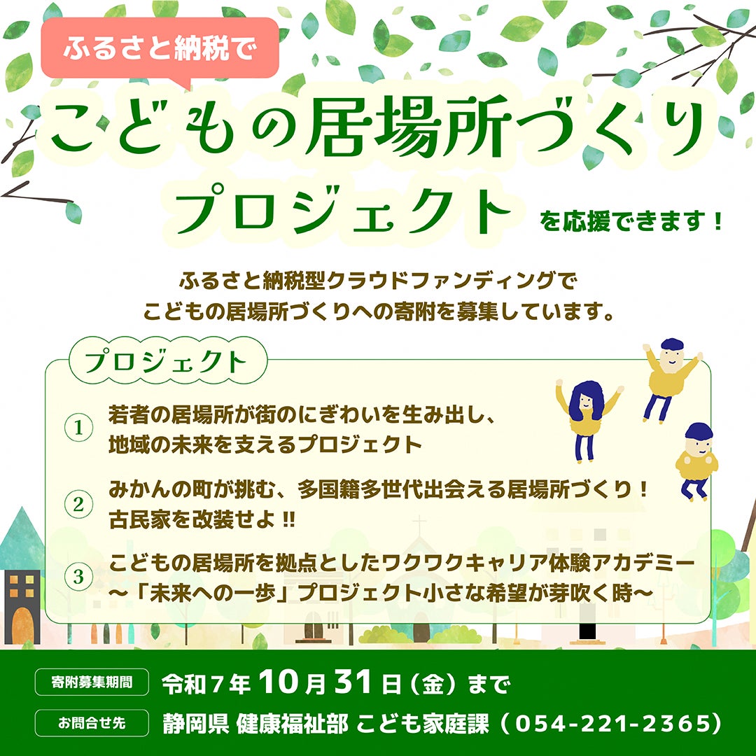 静岡県ではふるさと納税総合サイト「ふるさとチョイス」が提供するクラウドファンディング型でふるさと納税を募る仕組み「ガバメントクラウドファンディング®」(GCF®)で、こどもの居場所づくりの活動拡大に必要な資金調達に取り組む団体による3つのプロジェクトへの寄附を募集します。募集期間は8月1日(金)から10月31日(金)です。