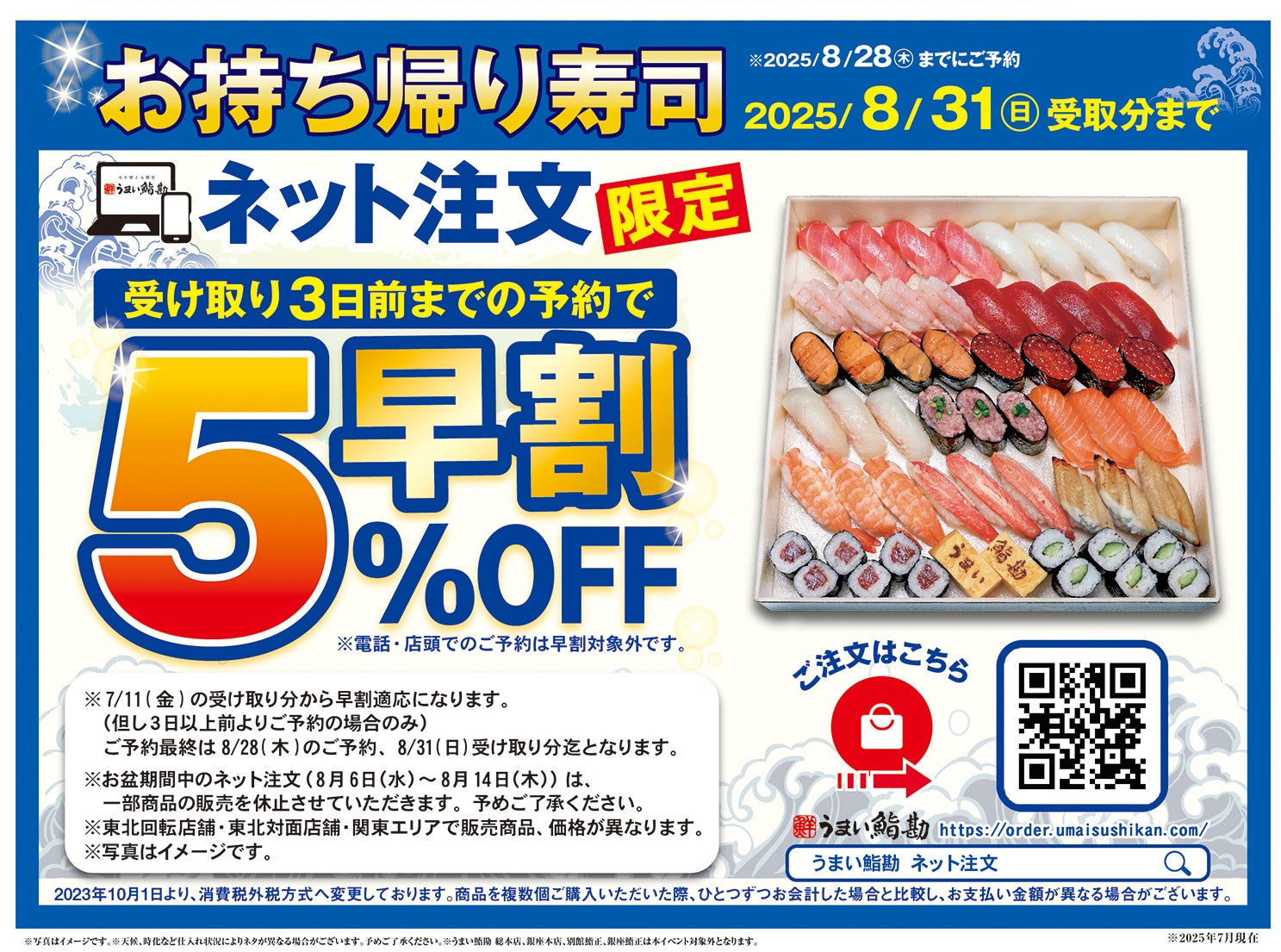 さらに、ネット注文限定「お持ち帰り寿司」早割5%OFF!