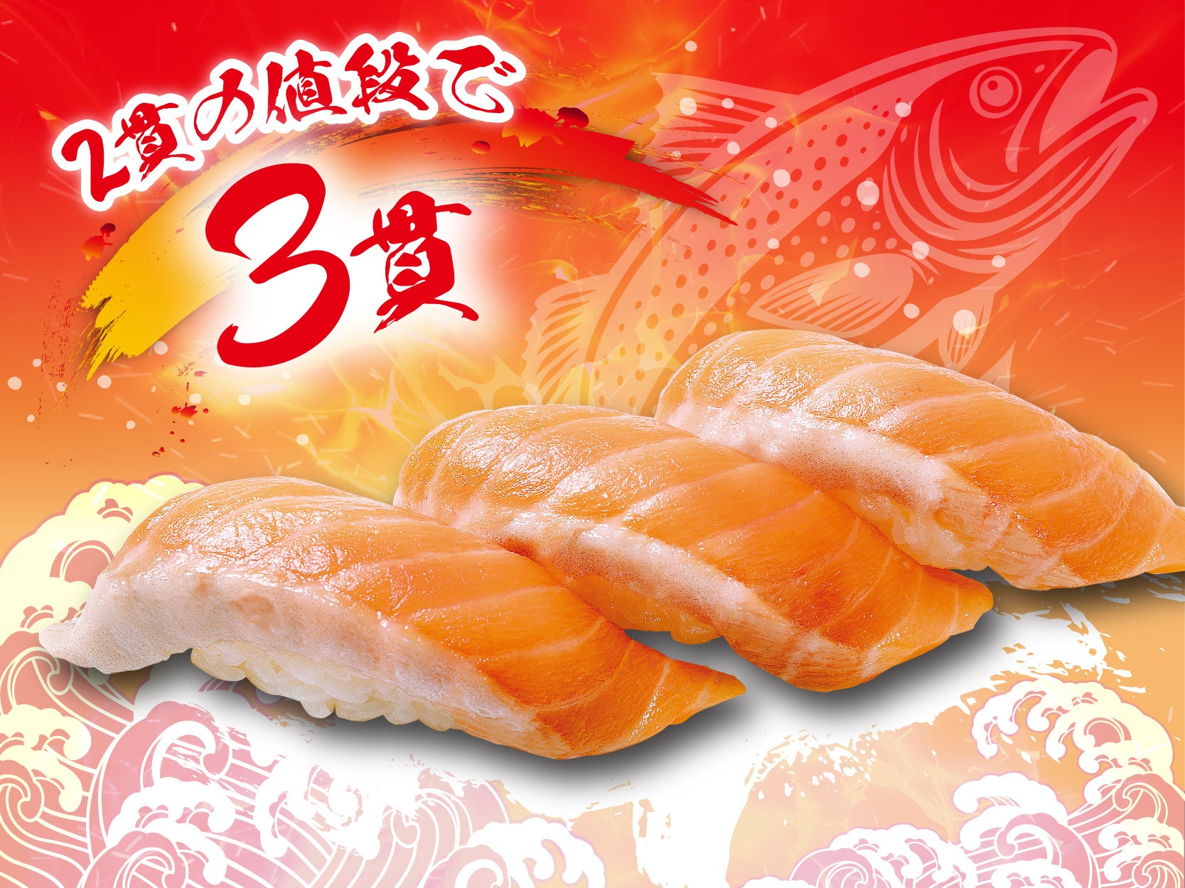 通常のとろサーモン1皿のお値段そのままに、今だけ1貫プラスの欲張りな「3貫」!