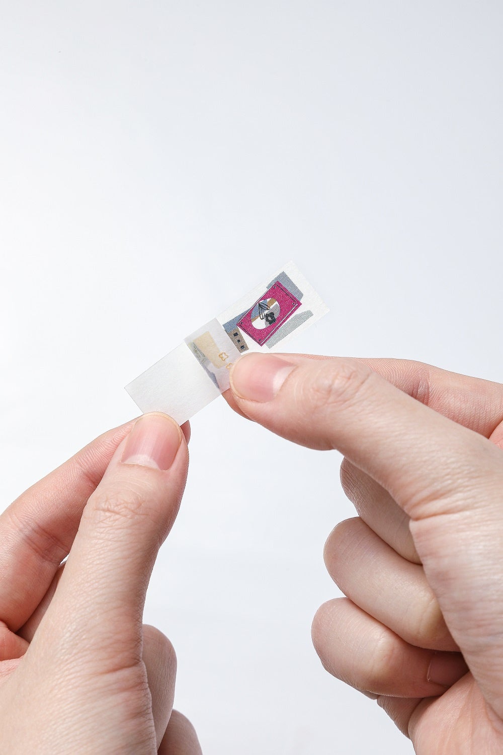 カードサイズの台紙に、5㎝の長さにカットされた裏紙付きのマスキングテープが収納されていて、台紙から1枚ずつ切りとり裏紙からはがして使用します。表紙を折りたたむとカードサイズになるため、手帳などのポケットに入れてコンパクトに持ち歩くことができます。また、裏紙が付いているため、マスキングテープをきれいな状態で人にあげたり、交換できます。