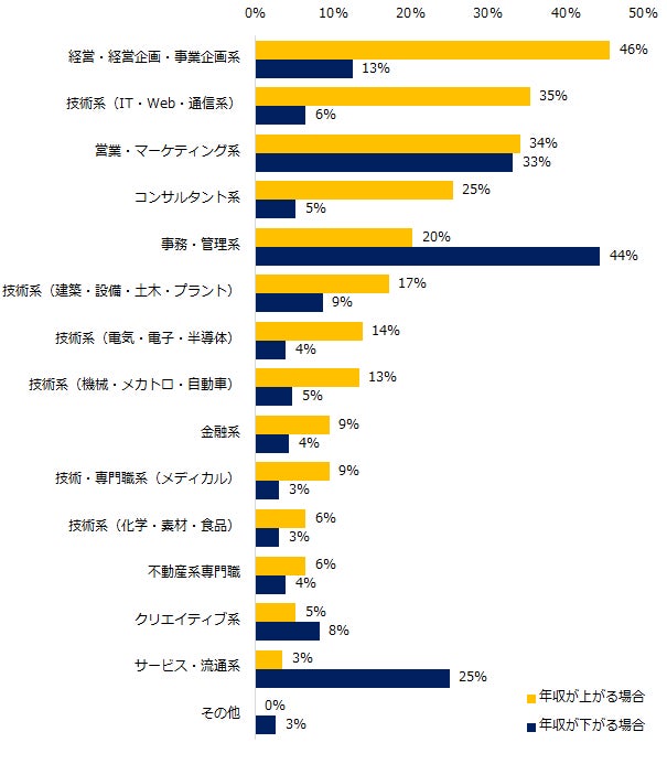 ・企業側の採用方針として、採用枠を減らしてより即戦力性の高い人の採用にシフトしてきており、それに伴いスキルが高い人は年収UPする方が増えているため。