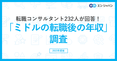 エン・ジャパン株式会社(本社:東京都新宿区、代表取締役社長:鈴木孝二)が運営するミドル世代のための転職サイト『ミドルの転職』(https://mid-tenshoku.com/)上で、サイトを利用している人材紹介サービスの転職コンサルタントに「転職後の年収」についてアンケートを行ない、232名から回答を得ました。以下、概要をご報告します。