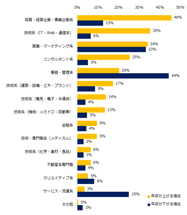 ・親和性のある業界への転職もしくは経営層など上流のマネジメント経験をしており、事業を俯瞰して見れるスキルがある方が年収アップを実現できる。