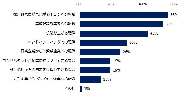 「ミドルの転職者は、どのようなケースで転職後に年収が上がる(下がる)ことが多いですか?」と伺うと、年収が上がるケーストップ3は「採用難易度が高いポジションへの転職」(56%)、「業績好調な業界への転職」(53%)、「役職が上がる転職」(43%)でした。一方、年収が下がるケースは「大手企業から中小企業への転職」(47%)、「役職が下がる転職」(47%)、「ベース給与が下がる異業種への転職」(46%)が上位にあがりました。