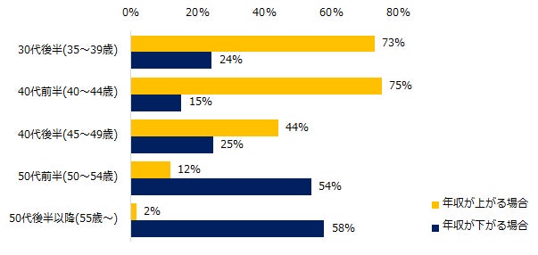 「転職後に年収が上がるミドルの年代」を聞くと、最多は「40代前半」(75%)でした。ついで「35歳後半」(73%)が続いており、35歳~44歳の人材需要の高さが伺えます。以降、「40代後半」(上がる場合:44%/下がる場合:25%)、「50代前半」(同:12%/54%)、「50代後半以降」(同:2%/58%)となり、40代前半をピークに、年収が上がる人は減少傾向です。
