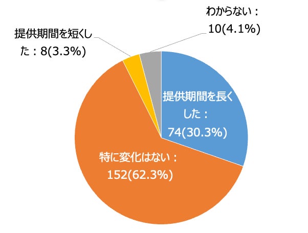 さらに、この数年で、「夏メニュー」の提供期間を変更したか聞いたところ、最も多い62.3%は「特に変わらない」としたものの、30.3%が「提供期間を長くした」と回答しました。