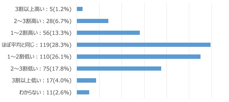次に、8月は、年間の月平均売上と比較して例年どの程度かについて聞いたところ、最も多かったのが「ほぼ平均と同じ」(28.3%)、続いて「1〜2割低い」(26.1%)、「2〜3割低い」(17.8%)という結果になりました。また逆に、「1〜2割高い」(13.3%)など、売上が高くなる飲食店も21.2%いる結果になりました。