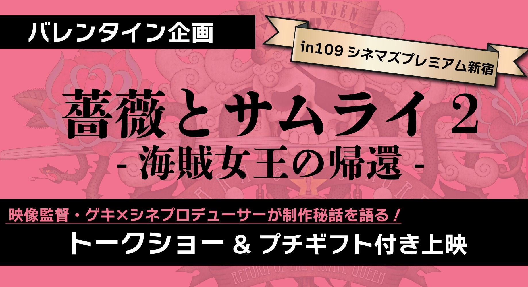 期間中の2月14日(金)にはバレンタイン企画として、オリジナルチョコレートのプチギフトが付いた、『薔薇とサムライ2-海賊女王の帰還-』Dolby Atmos版を上映します。さらに、上映前には本作の映像監督Lily Rinae氏とゲキ×シネプロデューサー金沢尚信氏のトークショーも実施!『ゲキ×シネ』の制作秘話をあますことなく語るトークショーとオリジナルチョコレートで、特別なバレンタインデーをお過ごしください。