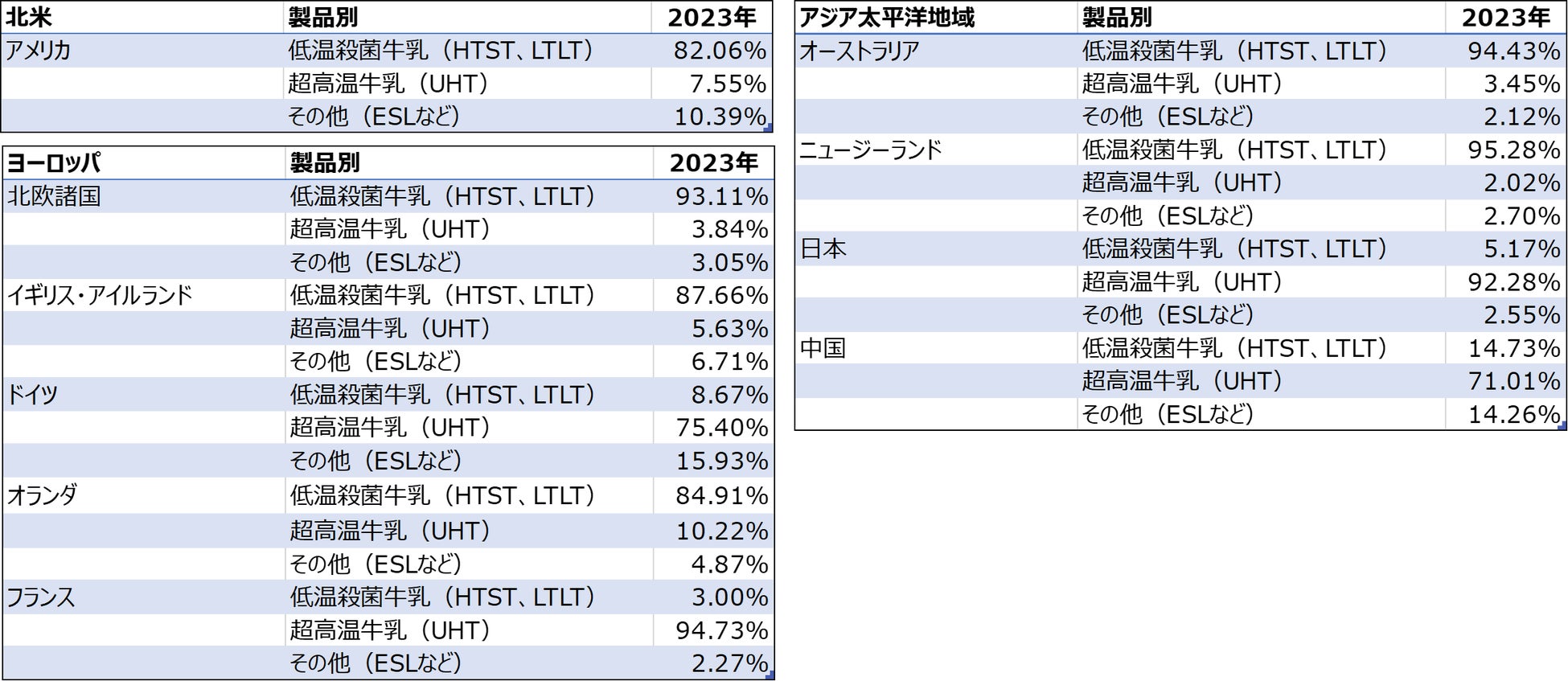 「パスチャライズド牛乳」(HTST)を含む、2023年の低温殺菌牛乳(HTST、LTLT)における市場シェアが、アメリカ、イギリス・アイルランド、オランダ、オーストラリア等で80%を超えているにも関わらず、日本ではわずか約5%という市場規模に。