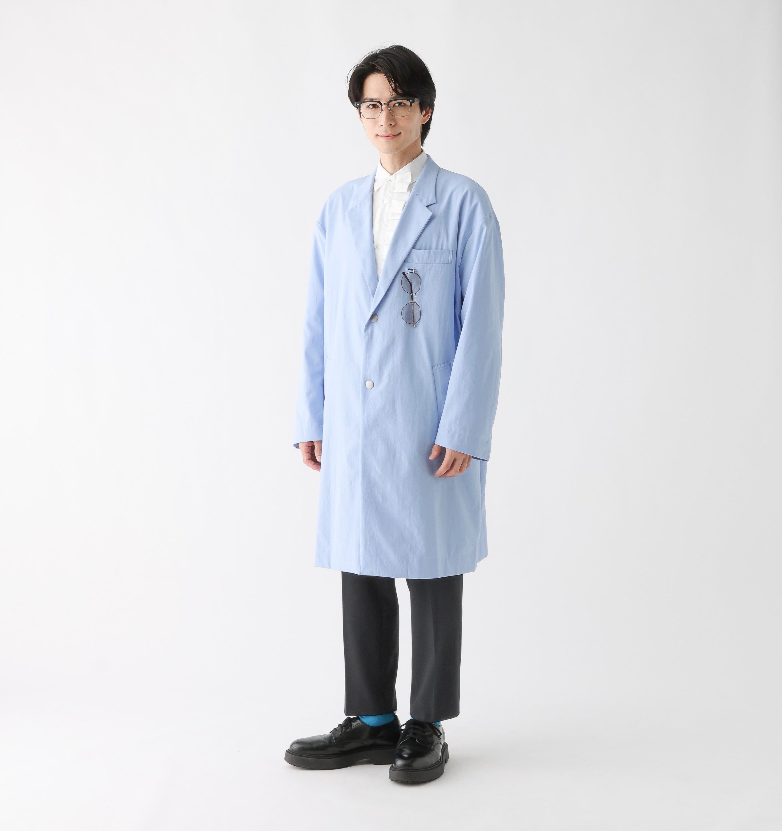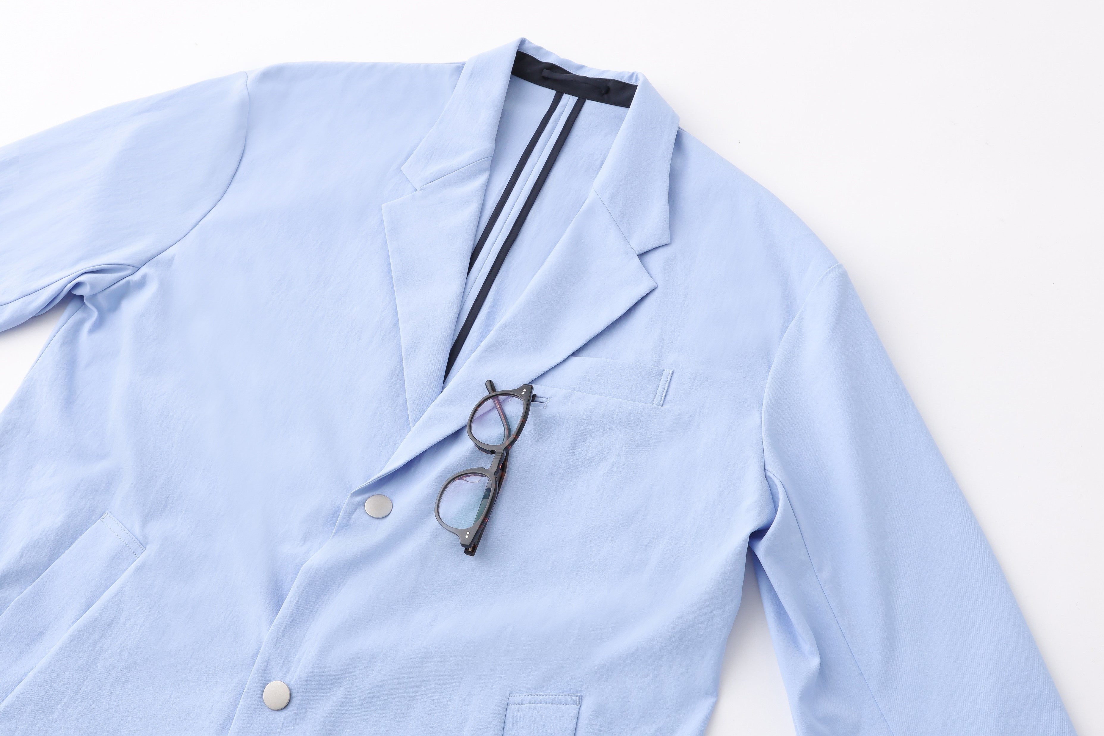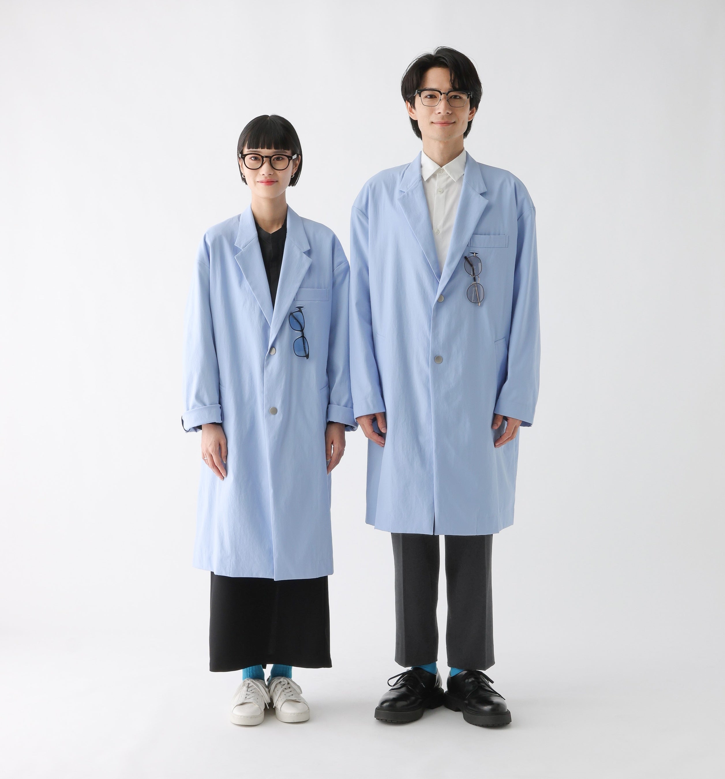 視覚に映え、清潔感あふれるサックスブルーのテイラードコートデザインです。トラディショナルでありながら緩やかなシルエットは、圧迫感が無く、ストレスフリーな着心地を実現しました。着る人の体型に沿ってキレイに落ちる肩の形状は、サイズの選択により、年代や体型、ジェンダーを問わず、好みのシルエットで着られます。ユニフォームのイメージを見つめ直し、着る人にとっての快適さを追求したシルエットです。