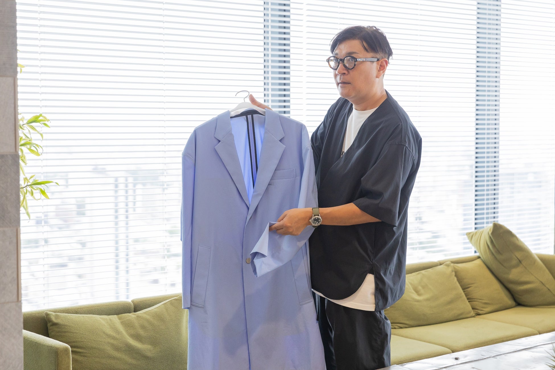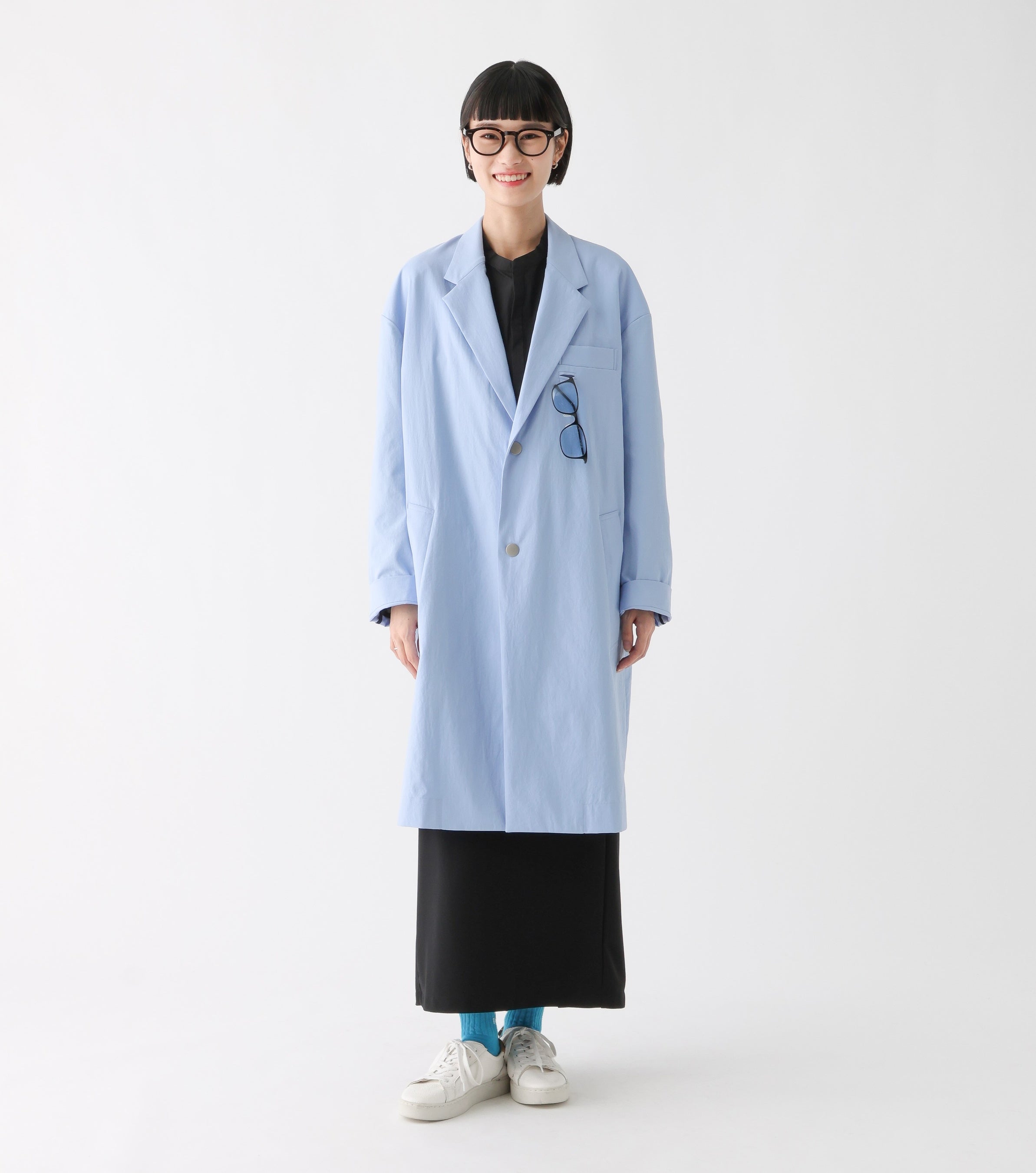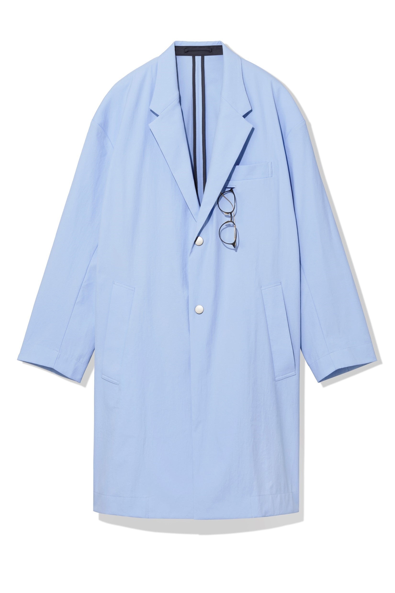 視覚に映え、清潔感あふれるサックスブルーのテイラードコートデザインです。トラディショナルでありながら緩やかなシルエットは、圧迫感が無く、ストレスフリーな着心地を実現しました。着る人の体型に沿ってキレイに落ちる肩の形状は、サイズの選択により、年代や体型、ジェンダーを問わず、好みのシルエットで着られます。ユニフォームのイメージを見つめ直し、着る人にとっての快適さを追求したシルエットです。