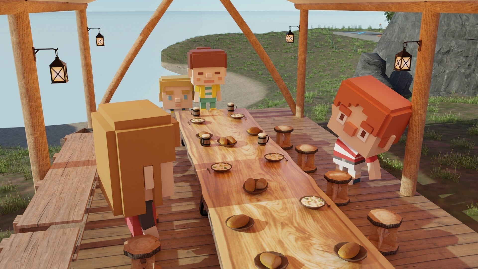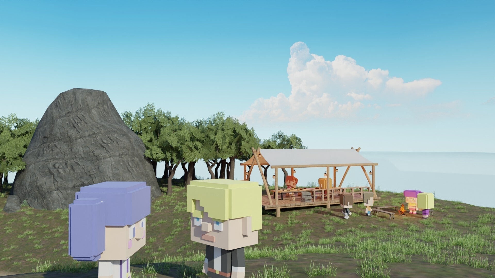 お客様に家にいながら非日常の体験を味わっていただけるよう、アイランド(島)空間をご用意いたしました。焚き火エリアやゲーム企画で利用する◯✕エリアなど、さまざまなエリアをご用意し、メタバース内で夏に旅行している気分をお楽しみいただけます。