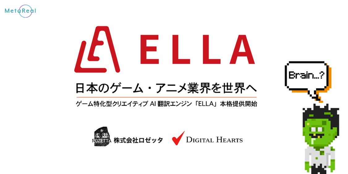 株式会社メタリアル(本社:東京都千代田区、代表取締役:五石 順一)グループで、対話型AI翻訳市場No.1*となるAIサービス開発・運営の株式会社ロゼッタ(代表取締役:渡邊 麻呂)と、株式会社デジタルハーツ(本社:東京都新宿区、代表取締役社長: 筑紫 敏矢)との共同開発による独自のゲーム特化型AI翻訳エンジン「ELLA」を活用した翻訳サービスが、デジタルハーツより2024年8月7日に正式ローンチされましたのでお知らせいたします。