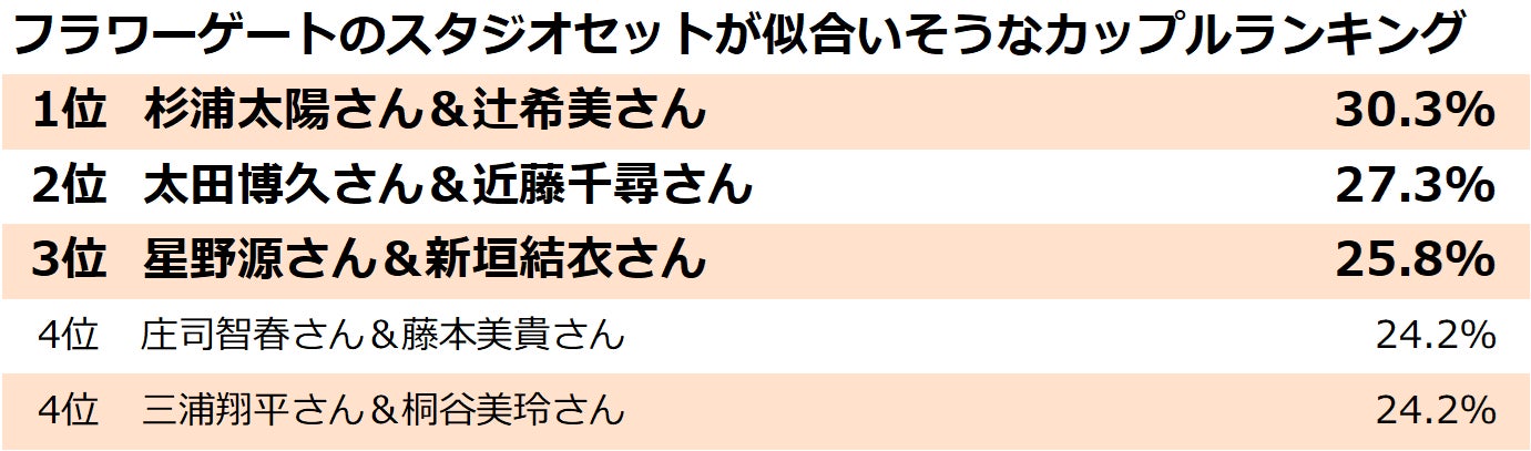 - フラワーゲートが似合いそうだと思う芸能人カップル1位は杉浦太陽さん&辻希美さん、SAKURA Chapelが似合いそうだと思う芸能人カップル1位はDAIGOさん&北川景子さん