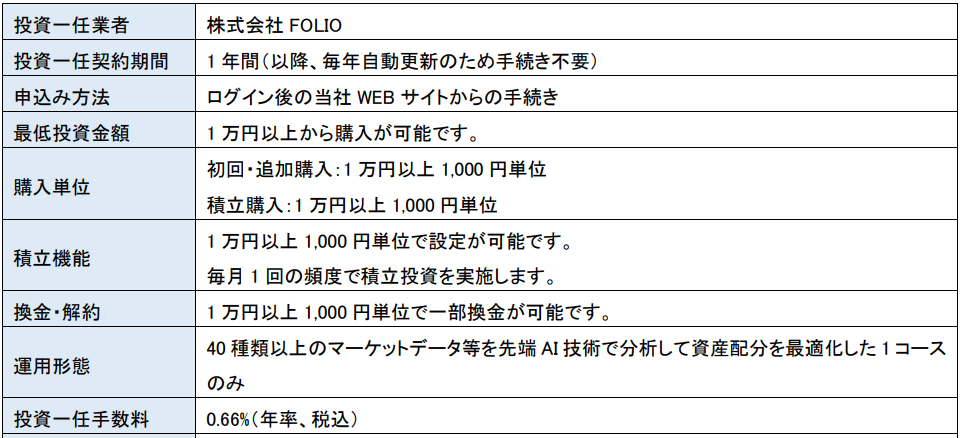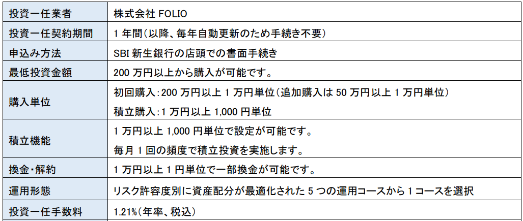 「SBIラップ」は、株式会社FOLIO(本社:東京都千代田区、代表取締役社長:甲斐真一郎)が提供する、投資一任サービスを提供するためのシステムプラットフォーム「4RAP」を採用し、運用業者が持つノウハウを最大限に活かした質の高い運用サービスを、低コストで提供しています。